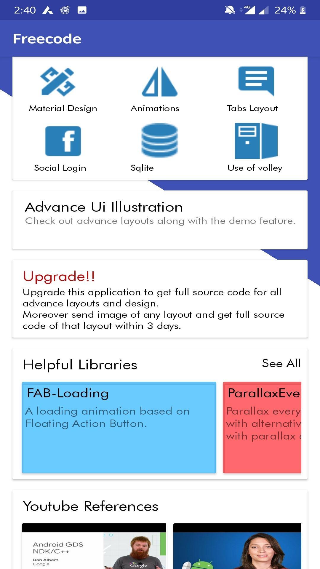 User can now find all code and illustration in a single android application. This application cover all the material design themes as well as social logins. Custom demonstration and