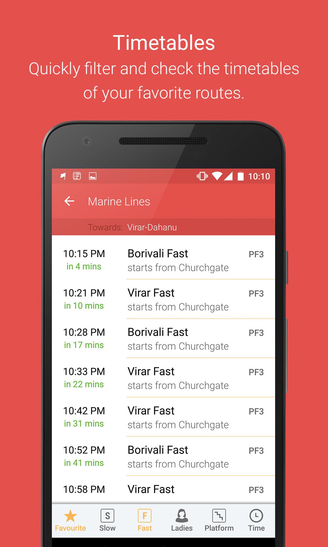 Get bus, metro and local train timetable in Mumbai, Delhi, Chennai, Kolkatta Bengaluru, Hyderabad & many more cities.