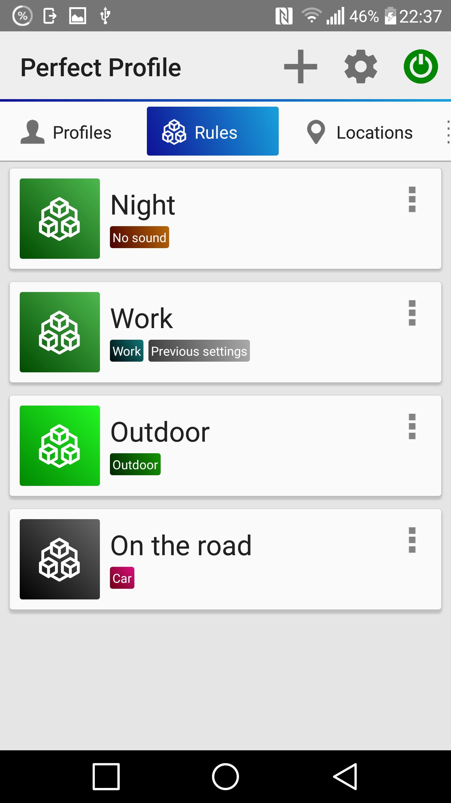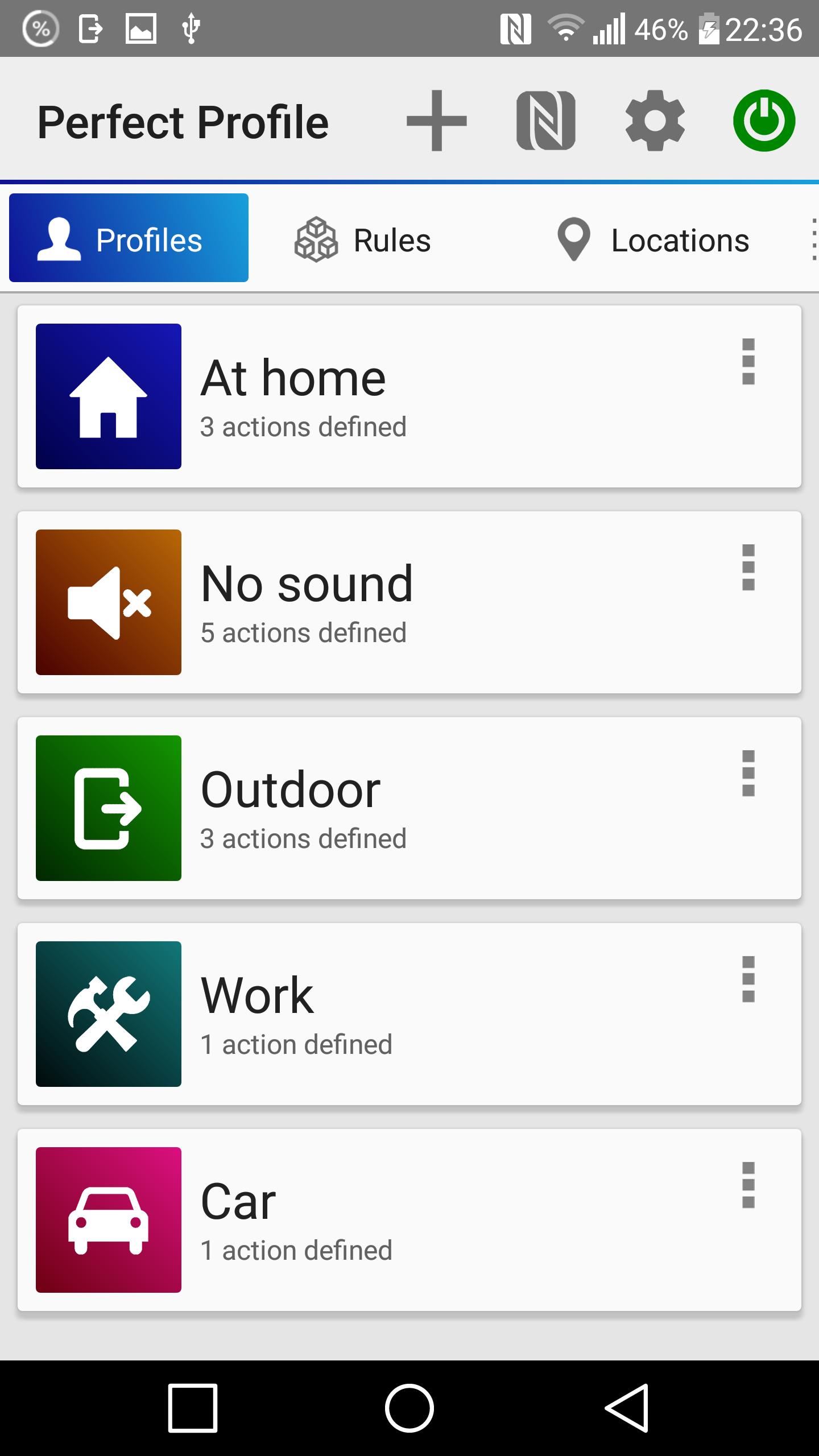 Perfect Profile is an easy-to-use profile manager, which provides more features and stability than competing Apps. With this app profiles with a lot of properties can be created and automatically activated via user defined rules. Widgets can be used to place profiles directly on the home screen. Furthermore profiles can be written to NFC tags. After touching the recorded NFC tag with your device the corresponding profile will be activated immediately.