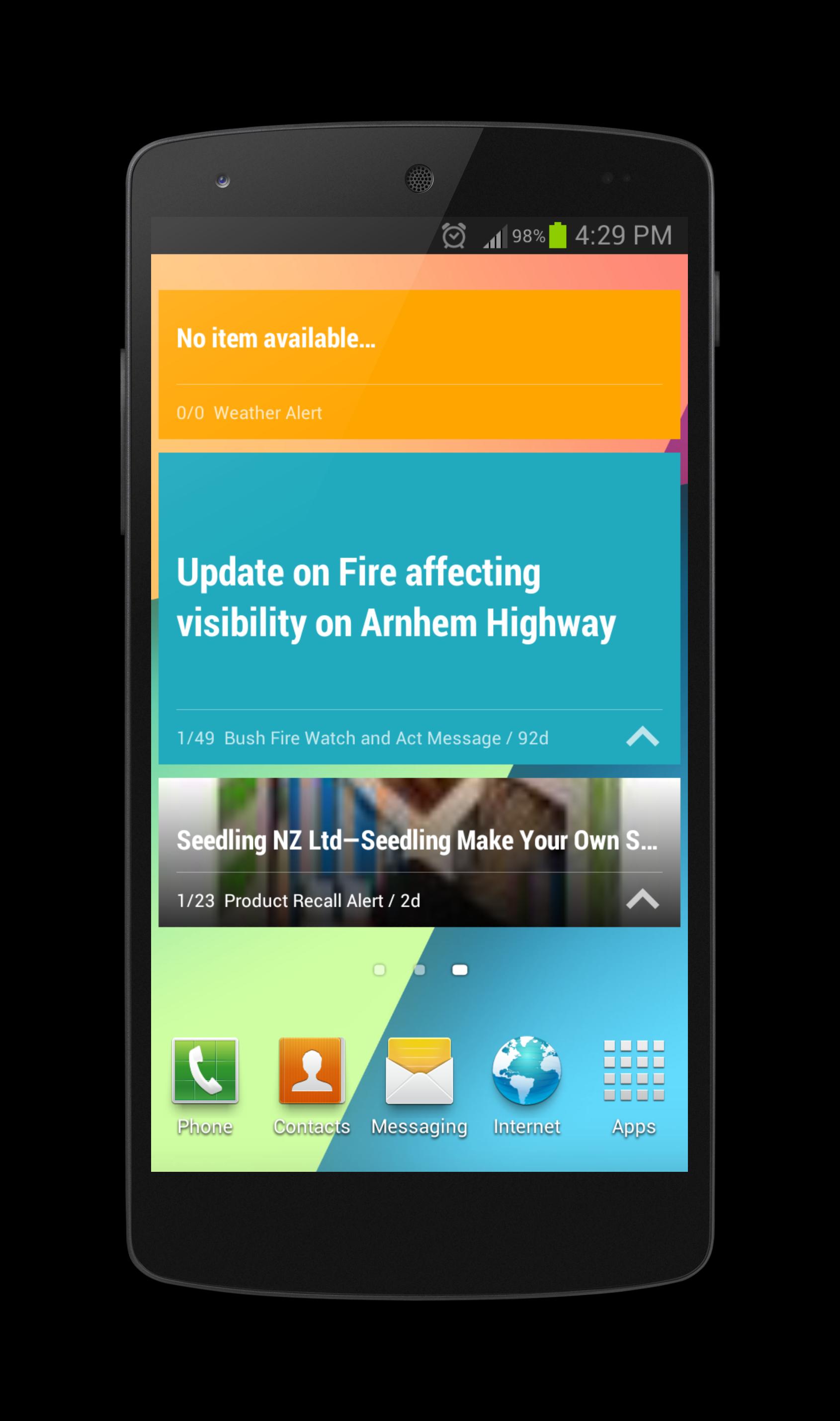 Weather, Northern Territory Bush Fire, Traffic, Health, UV index, Product recall Alerts all in one package for Northern Territory residents.