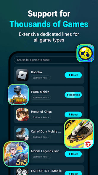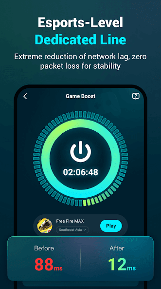 Three-step simplicity: Select game → Choose server → Tap to boost. Instantly activate ultra-low latency gaming networks.