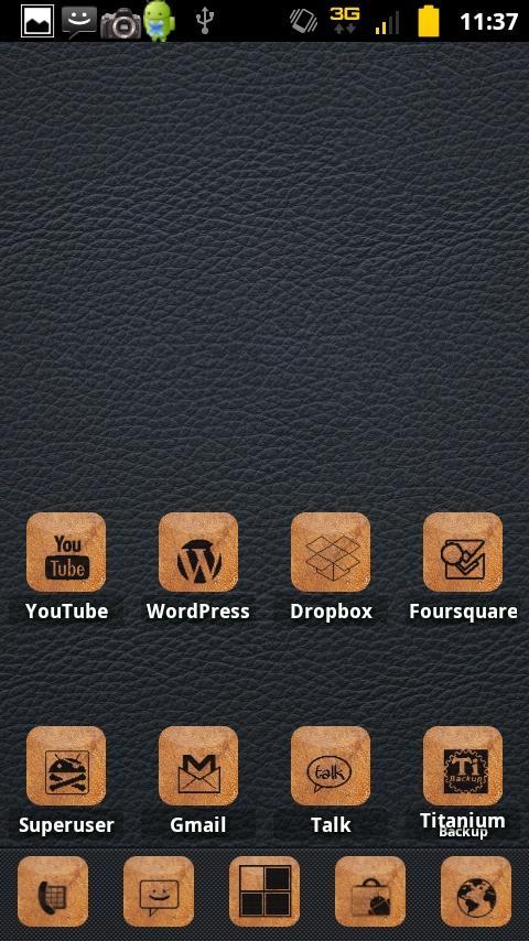 This is a free preview of my Burnt Leather theme designed for ADW.launcher and ADW EX launcher that now works with LauncherPro and LauncherPro Plus now. This is a working preview with 70+ icons of mostly normal system apps and 2. This free preview will not be updated. The full theme includes nearly 200 icons, 7 wallpapers, and 3 docks for those able to change dock backgrounds and will be updated with requested icons. This is to give you a preview on quality and over sense of how it looks. Enjoy!