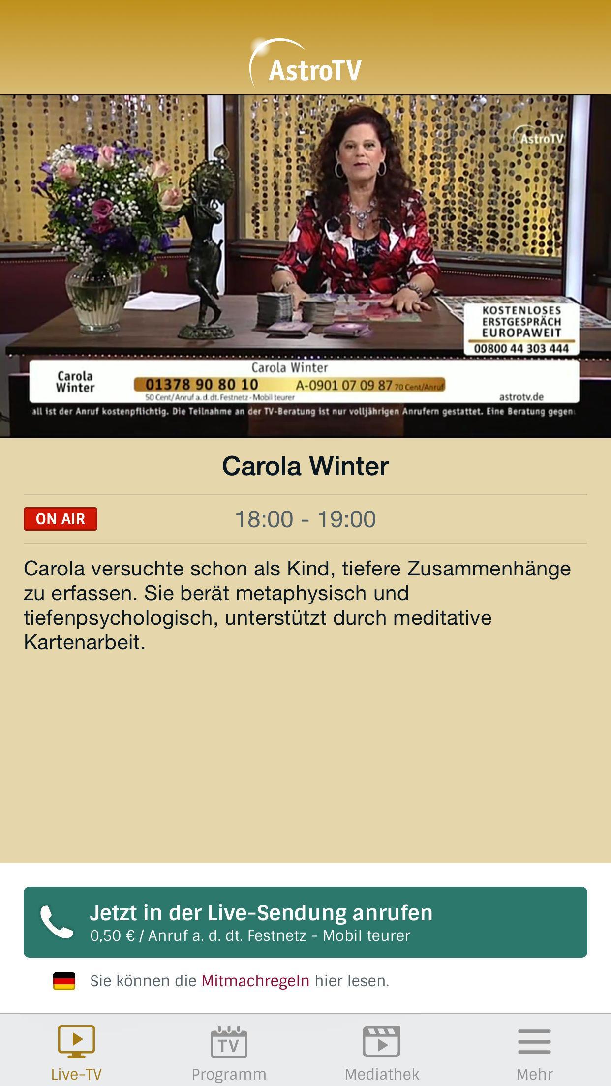 With the new AstroTV app, you can call live in the current program (paid feature) and receive advice on live TV, whether spirituality, card reading, fortune telling, astrology, tarot, numerology! **