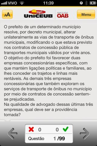سيساعدك هذا التطبيق على إجراء الامتحان إلى OAB. هناك أكثر من 800 سؤال محدث ، مستخرجة من امتحانات حقيقية من المنطقة الفيدرالية. استخدام التطبيق بسيط للغاية وفي أي وقت يمكنك النقر فوق الزر "مساعدة" للإجابة على الأسئلة. بعد اختيار البديل ، يقوم التطبيق بإبلاغ الإجابة الصحيحة وعدد الأسئلة الصحيح أو الخطأ حتى الآن. في نهاية السباق ، يمكنك الكشف عن النتيجة على Facebook.