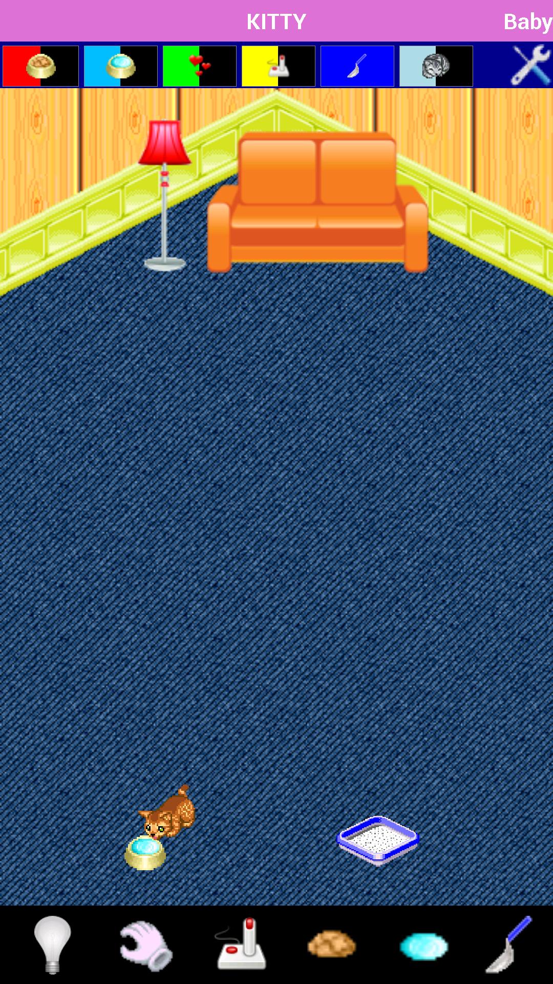 - المصباح: انقر فوقه لإرسال حيوانك الأليف الظاهري للنوم أو إيقاظه. لتحميل شريط التعب وضع قطتك في حالة النوم.