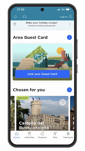 Der erste Schritt? Verknüpfen Sie Ihre Trentino -Gastkarte mit der App, um die vielen Vorteile zu genießen, die sie bietet: kostenlosen oder ermäßigten Eintritt in Burgen und Museen, Führungen und exklusive Verkostungen, kostenlose Nutzung des öffentlichen Verkehrs und die Möglichkeit, Aktivitäten und Dienstleistungen für Ihren Urlaub zu buchen. Um Ihre Karte zu erhalten, müssen Sie lediglich einen Aufenthalt in einer der Unterkunftseinrichtungen von Trentino buchen.
