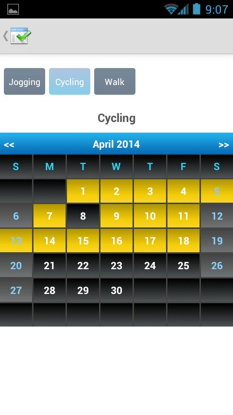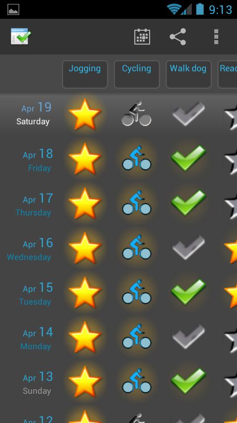 Sei es Bewegung, Ernährung, Bloggen oder eine unerwünschte Angewohnheit, nutzen Sie Daily Badge , um den Fortschritt jeden Tag zu verfolgen. Tracking ist einfach. Tippen Sie unter dem Ziel auf den Stern des Tages, um ihn für den Tag abgeschlossen zu markieren. Mach es jeden Tag weiter. Halten Sie die Kette am Laufen.