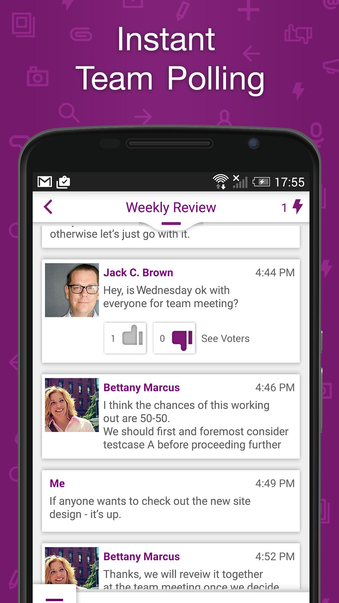 Holen Sie sich sofortiges Feedback von Ihrem Team mit einem integrierten und nahtlosen Wahlwerkzeug. Kein Bedürfnis nach einer fortgeschrittenen Plattform von Drittanbietern, um Ihren Teammitgliedern nach ihrer Meinung zu bitten.