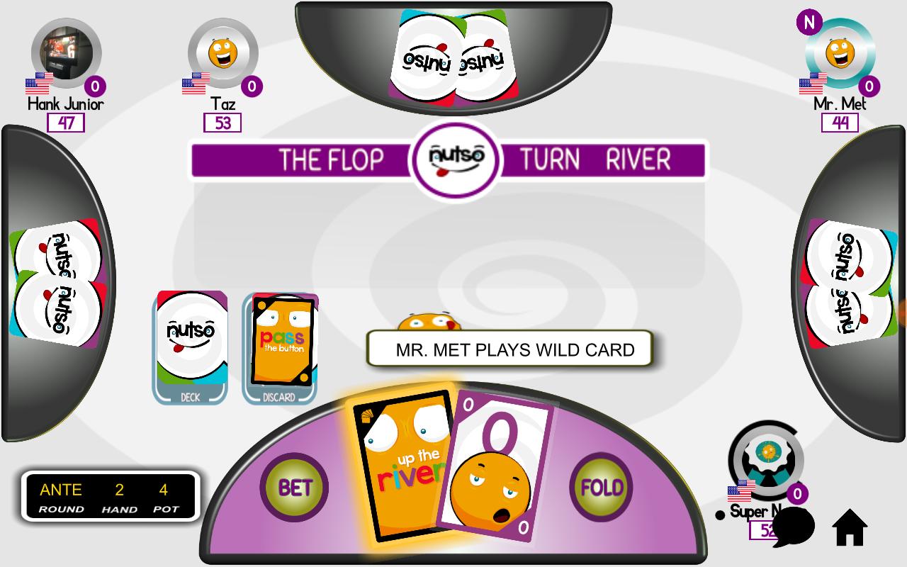 Spielen Sie " NUTSO " ein lustiges Poker -Kartenspiel. Machen Sie mit 2 Lochkarten und 5 Community -Karten die beste 5 Kartenhand. Auch Wildkarten können den mächtigsten Hände in einen Verlierer verwandeln. Letzte mit Chips gewinnt das Spiel.