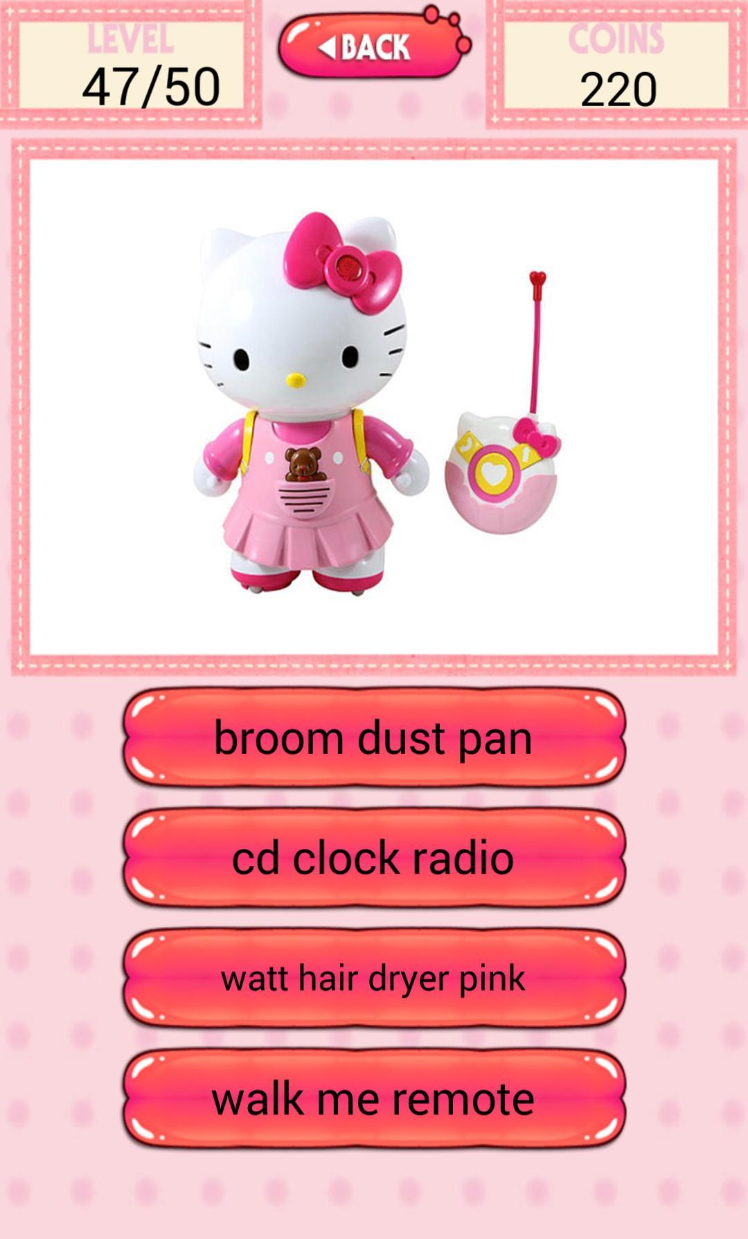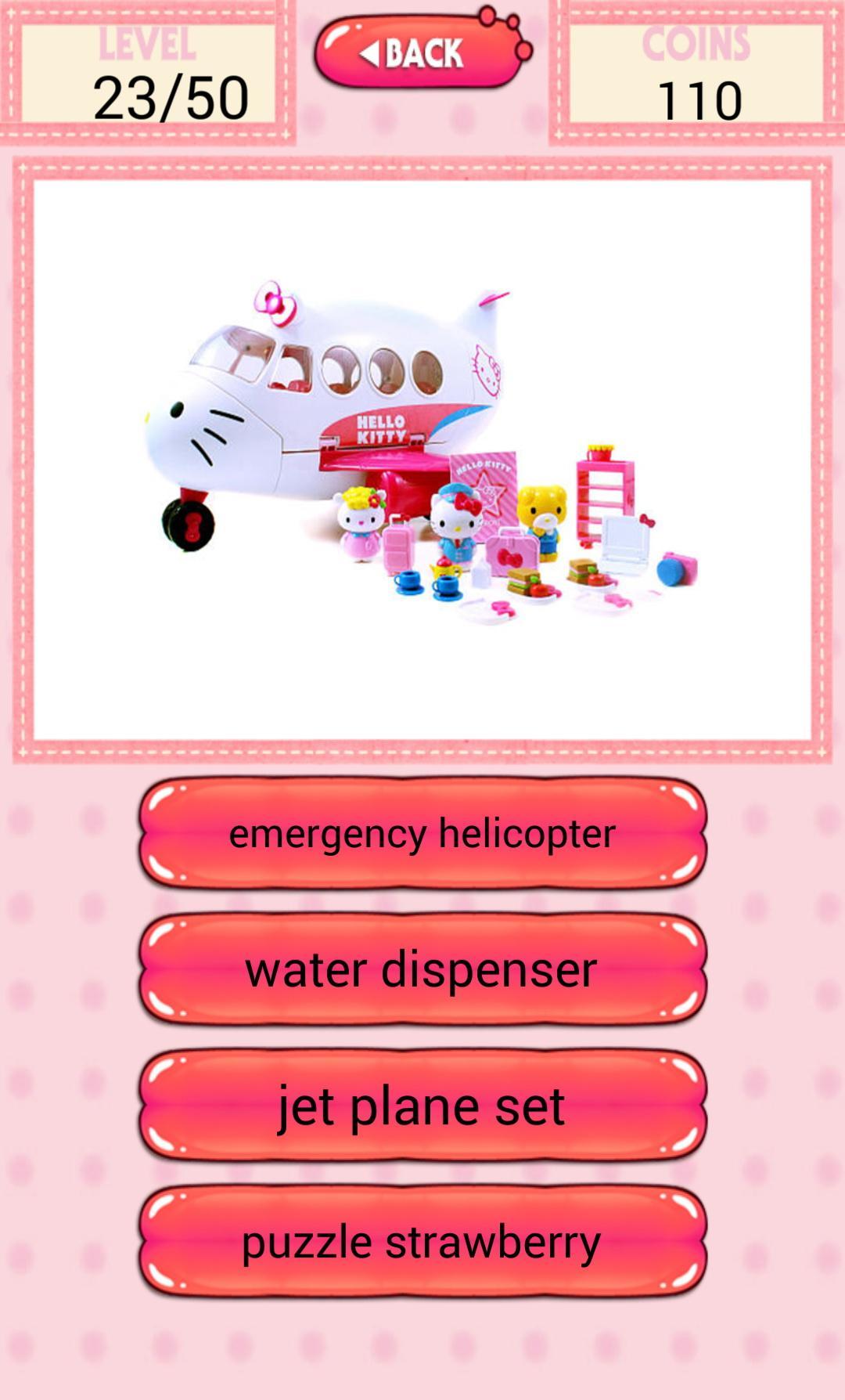 Hallo Quizspielzeugspiel für Kinder. Der Ratenname des Spielzeugs berühmt mit Cartoon -Charakter im Hello Kitty. Wählen Sie die richtige Antwort. Die Entwicklung des Gehirns und entwickeln Sie Ihre Gedächtnisfähigkeiten, konkurrieren Sie mit Ihren Freunden und Ihrer Familie, um mehr Punkte zu sammeln. Genießen Sie kostenlos und Spaß. Wenn Sie Spielzeug im Spiel mögen und die echten Spielsachen erleben möchten. Wir haben viele Spielzeug für Hello Kitty. Bitte sehen Sie sich das eigentliche Produkt auf einer Spielzeugeinkaufsseite oder einem Spielzeuggeschäft in Ihrer Nähe und Spaß beim Einkauf.
