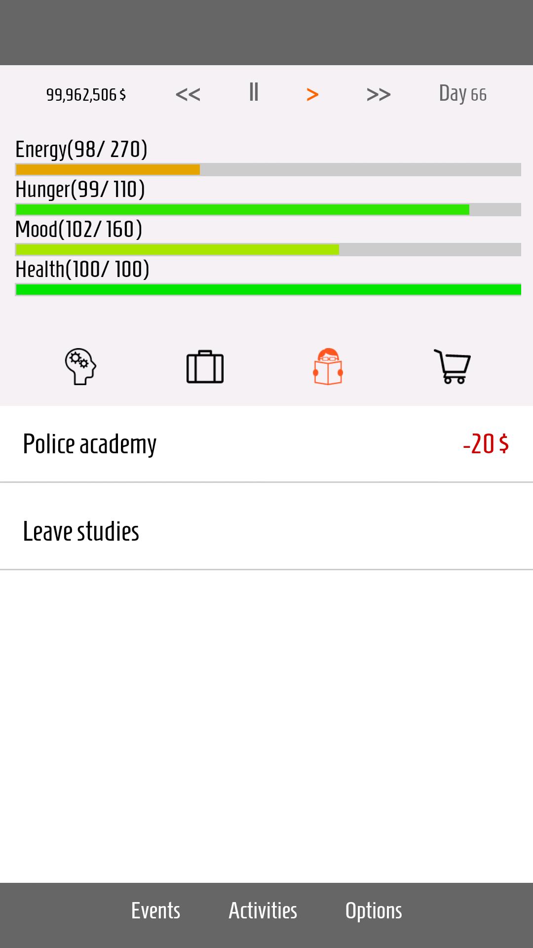 Life simulator . Beginnen Sie vom niedrigsten Ende mit Ihrem Charakter und gehen Sie nach oben. Kümmere dich um deine Staaten, Energie, Hunger, Stimmung und Gesundheit. Sie müssen die unterschiedlichen Umstände überleben, die während des gesamten Spiels erstellt werden. Wählen Sie aus verschiedenen Berufen und Aktivitäten und starten Sie Ihre Karriere von Grund auf neu. Was wirst du sein? Vielleicht ein Arzt oder Anwalt? Oder eröffnen Sie Ihr eigenes Restaurant? Sie können sogar einen Präsidenten und vielleicht den Marsboden mit dem Marsboden bekommen. Wer weiß. Erleben Sie das Leben des virtuellen Lebens