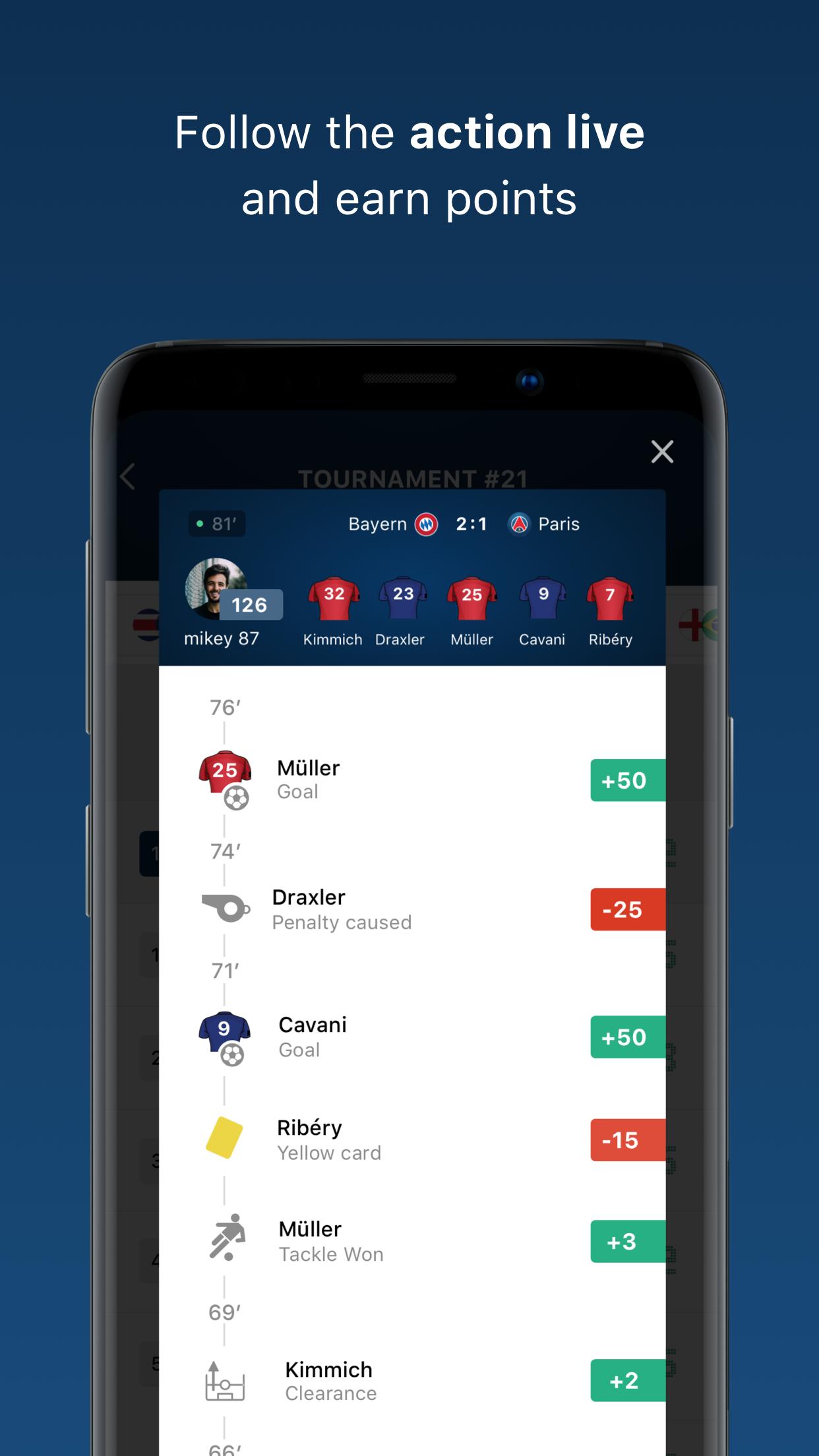 Spielen Sie mit Ihren Freunden Fantasy -Fußball, indem Sie 5 Spieler eines echten Fußballspiels auswählen. Ihre eigentliche Leistung während des gesamten Spiels bestimmt Ihre Punktzahl und Sie können ihm live folgen.