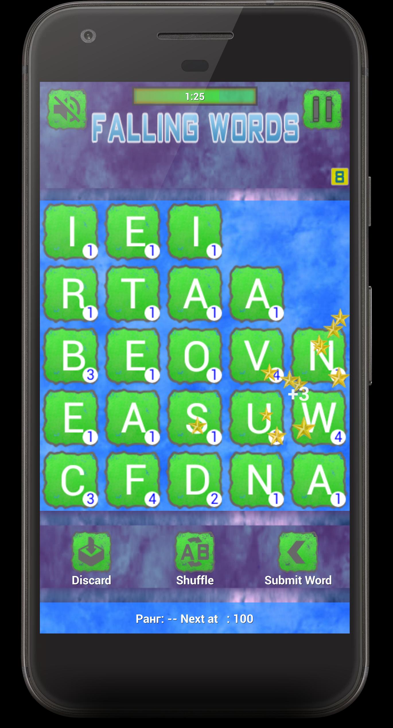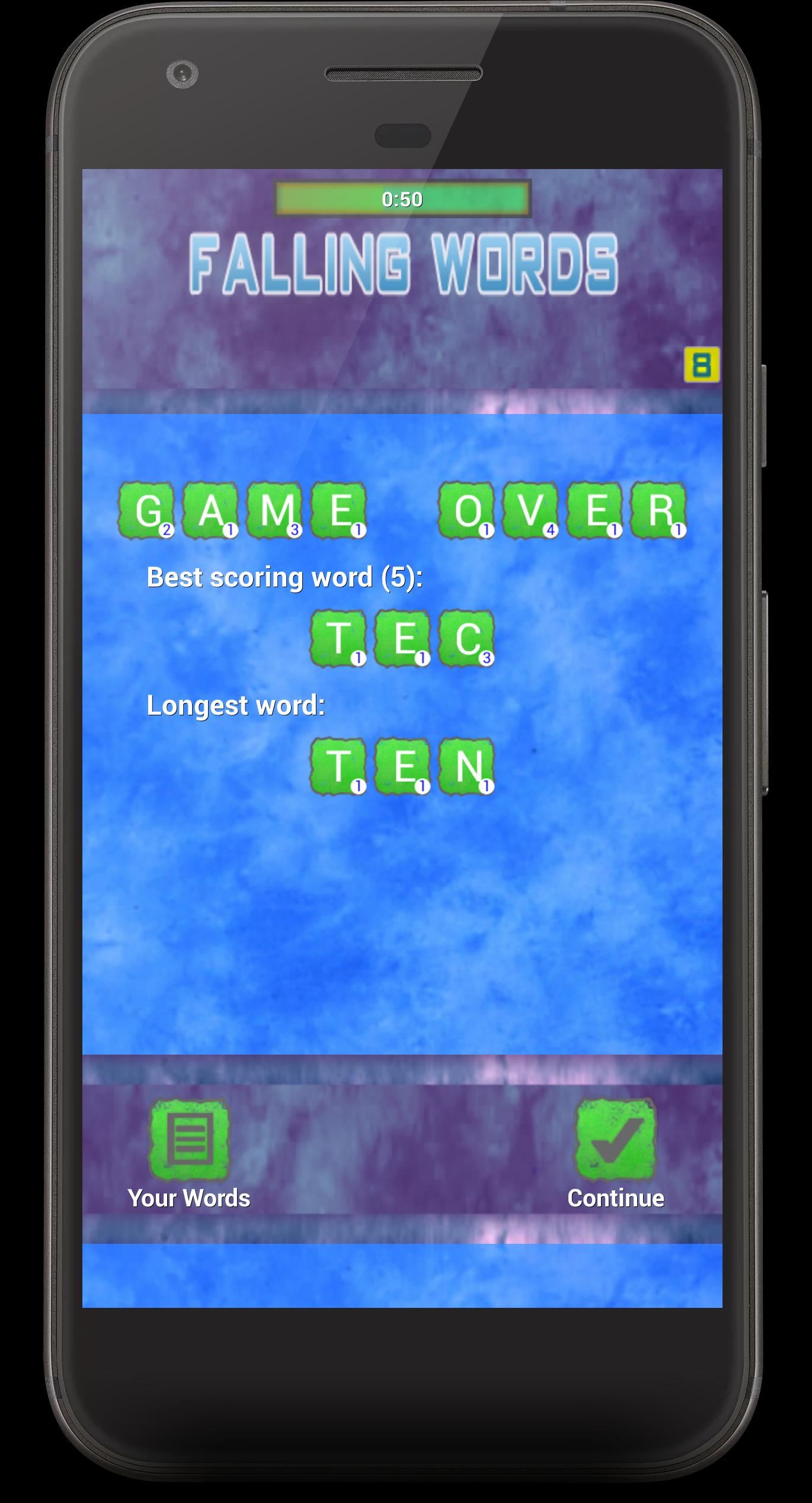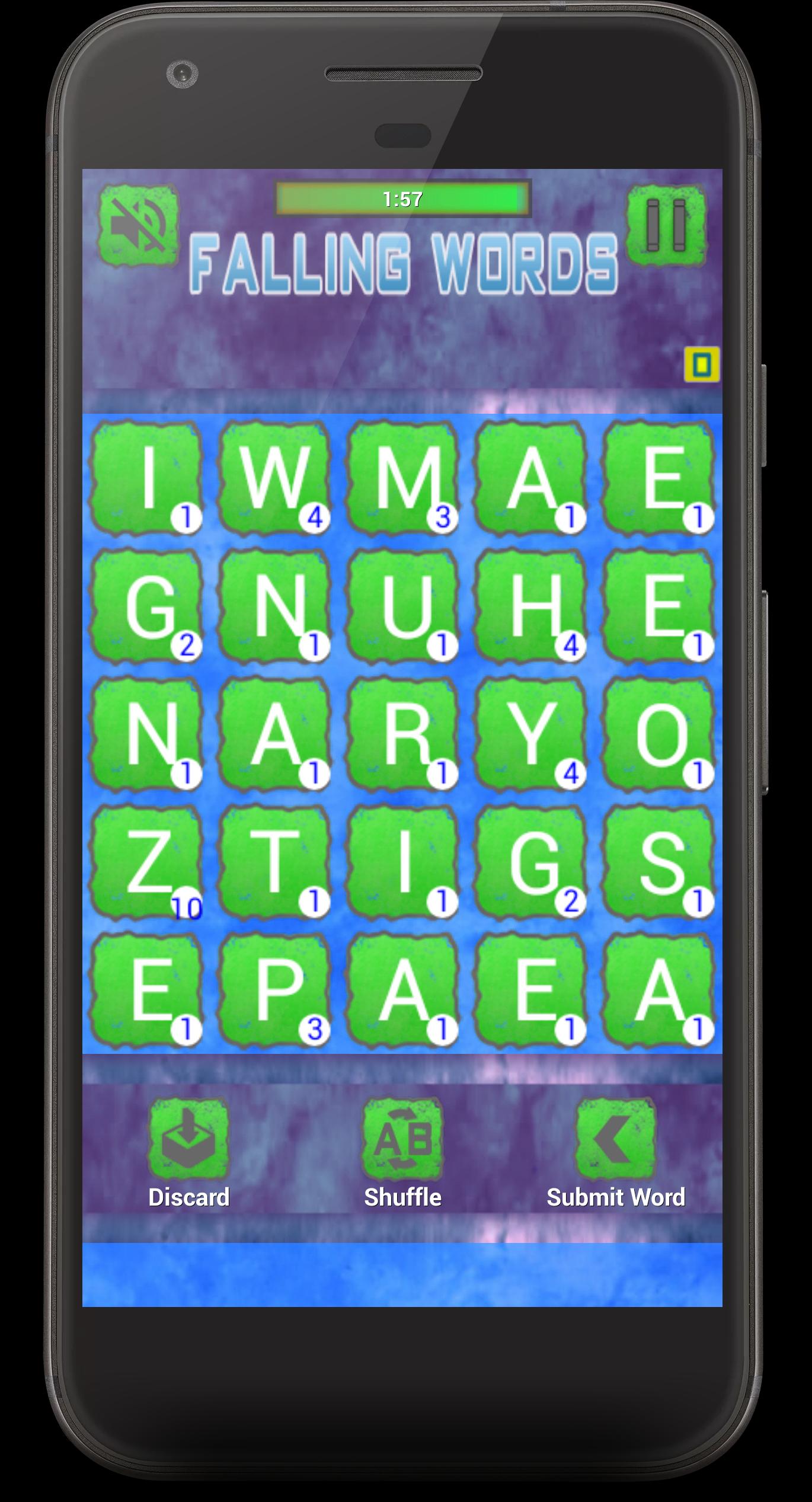 Falling Words ist ein Puzzlespiel, bei dem Sie nicht gelangweilt werden, dass Sie Wörter aus Buchstaben horizontal, vertikal oder diagonal addieren. Für eine bestimmte Zeit müssen Sie mehr Wörter addieren, neue Wörter fallen von oben.