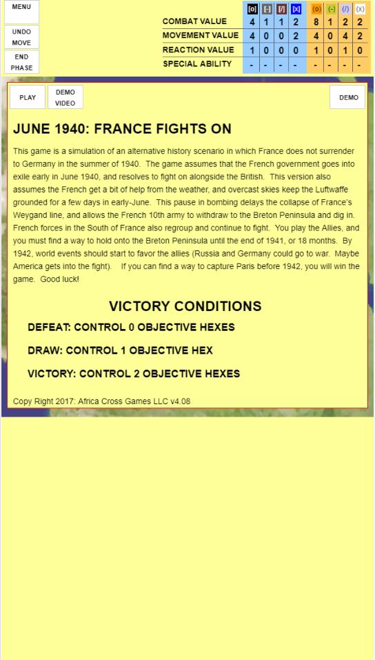 Dieses Spiel ist eine Simulation eines alternativen Geschichtsszenarios, in dem sich Frankreich im Sommer 1940 nicht an Deutschland ergibt. Das Spiel geht davon aus, dass die französische Regierung Anfang Juni 1940 in das Exil einfließt und sich entschlossen, neben den Briten zu kämpfen. Diese Version geht auch davon aus, dass die Franzosen vom Wetter ein wenig Hilfe bekommen, und bewölkter Himmel hält die Luftwaffe im frühen Juni für ein paar Tage auf dem Laufenden. Diese Pause bei der Bombardierung verzögert den Zusammenbruch der Weygand -Linie Frankreichs und ermöglicht es der französischen 10. Armee, sich auf die Breton -Halbinsel zurückzuziehen und sich in die französischen Streitkräfte in Südfrankreich zu gruppieren und weiter zu kämpfen. Sie spielen die Alliierten und müssen einen Weg finden, sich bis Ende 1941 oder 18 Monate an der Breton -Halbinsel festzuhalten. Bis 1942 sollten Weltveranstaltungen die Verbündeten bevorzugen (Russland und Deutschland könnten in den Krieg ziehen. Vielleicht gerät Amerika in den Kampf). Wenn Sie vor 1942 einen Weg finden können, Paris zu erfassen, gewinnen Sie das Spiel.