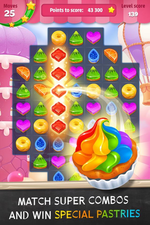 Fahren Sie durch Baumwollwiederholzstadt, Orange -Stadt, Geburtstagsstädte und viele weitere aufregende Städte, um der Kuchenmeister zu werden! Schließen Sie sich Oma Fea an, dem Muffinliebhaber und Mr. Marshmallow in ihrem Zucker -Rush -Abenteuer durch das Kuchenimperium. Passen Sie sich in diesem spektakulären Puzzle -Abenteuer über 200 Levels an.