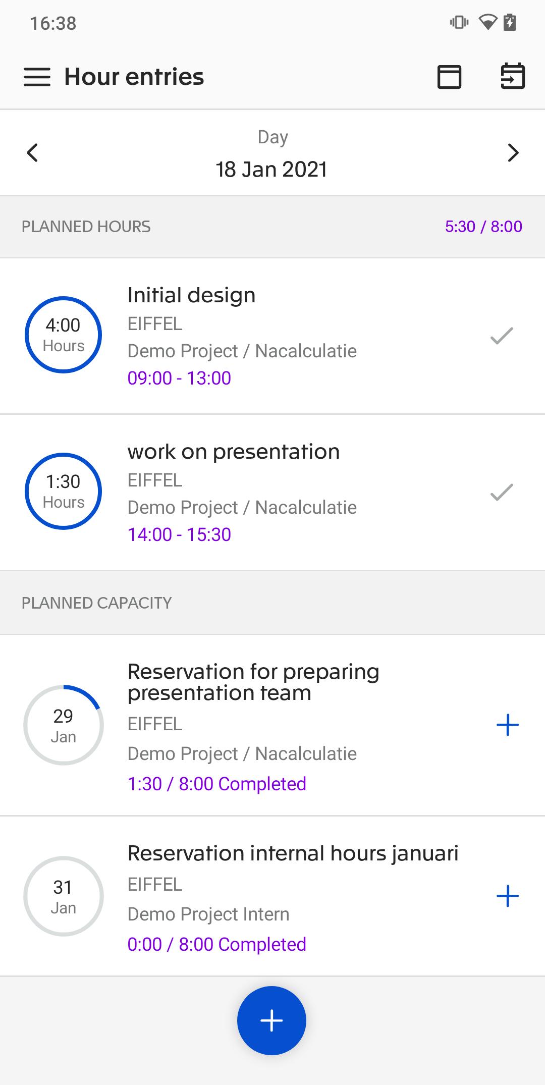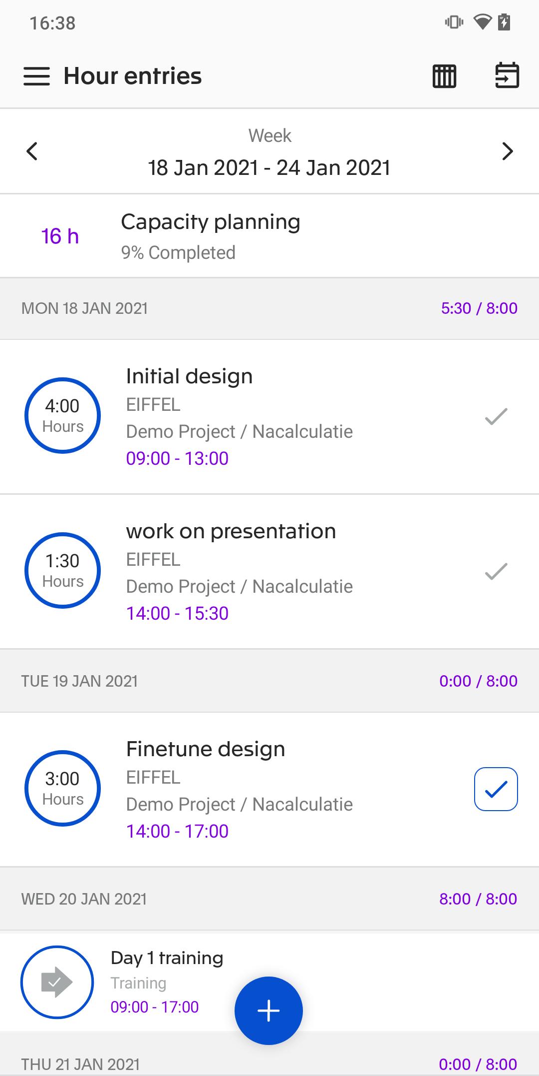 A través de las descripciones de día y semana de cristal, tiene una visión completa de todas sus actividades planificadas y planificación de capacidad. Terminó un trabajo temprano? Ajuste instantáneamente la duración y envíe las horas.