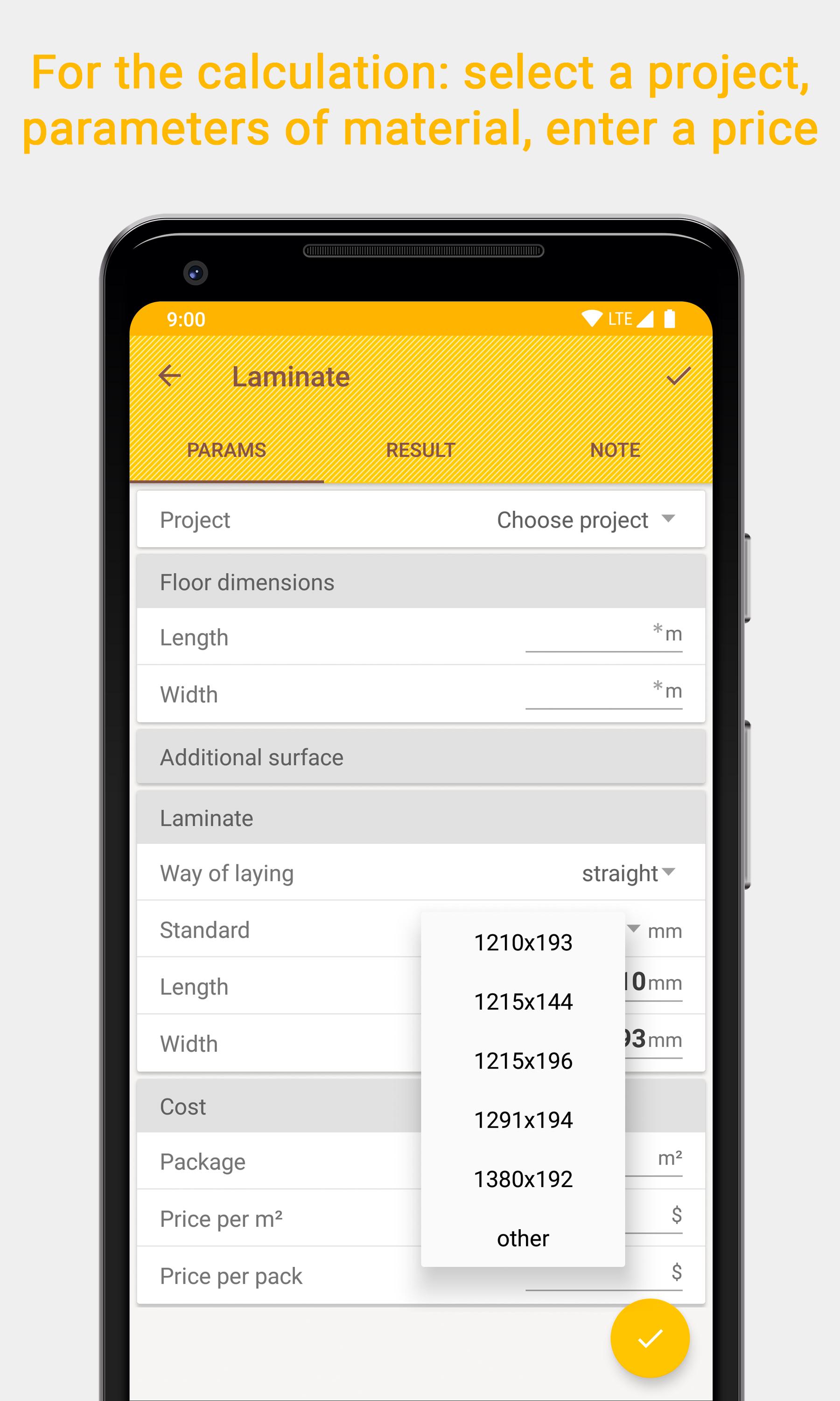 La aplicación calcula la cantidad de material con una reserva (por ejemplo, azulejos y pisos laminados) en caso de defectos o daños en el proceso de renovación. Siempre puede ver el resultado sin reservar haciendo clic en "* El resultado con 5 (10)% de reserva".