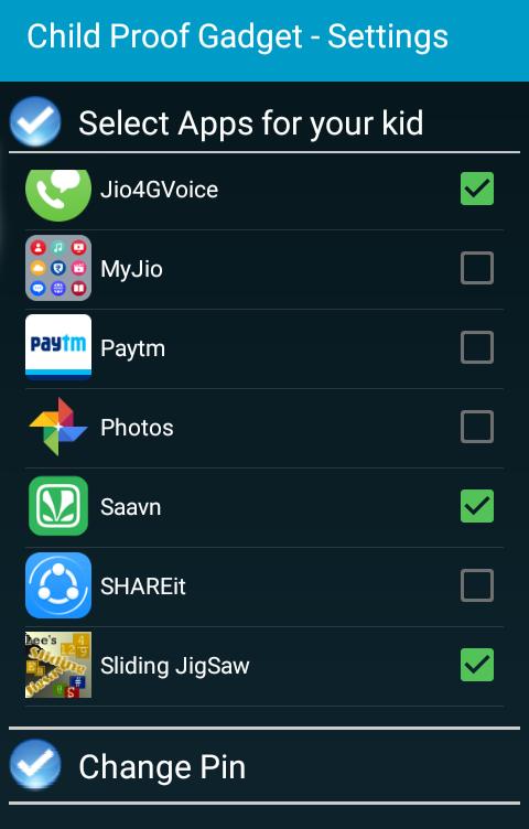 1. Si desea iniciar la aplicación y olvidar el PIN, borre los datos de la configuración à Administrar aplicaciones à Child Proof Gadget ... luego inicie la aplicación. Le pedirá que registre un pin nuevo.