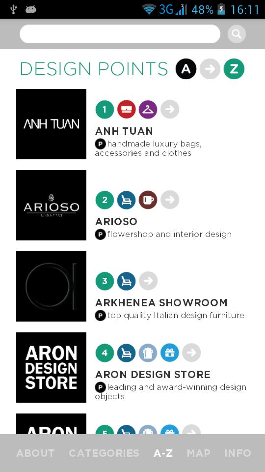 - Un directorio rico con información clave (dirección, horarios de apertura, etc.), fotos y descripciones de los puntos de diseño destacados, que se pueden clasificar alfabéticamente y por categoría