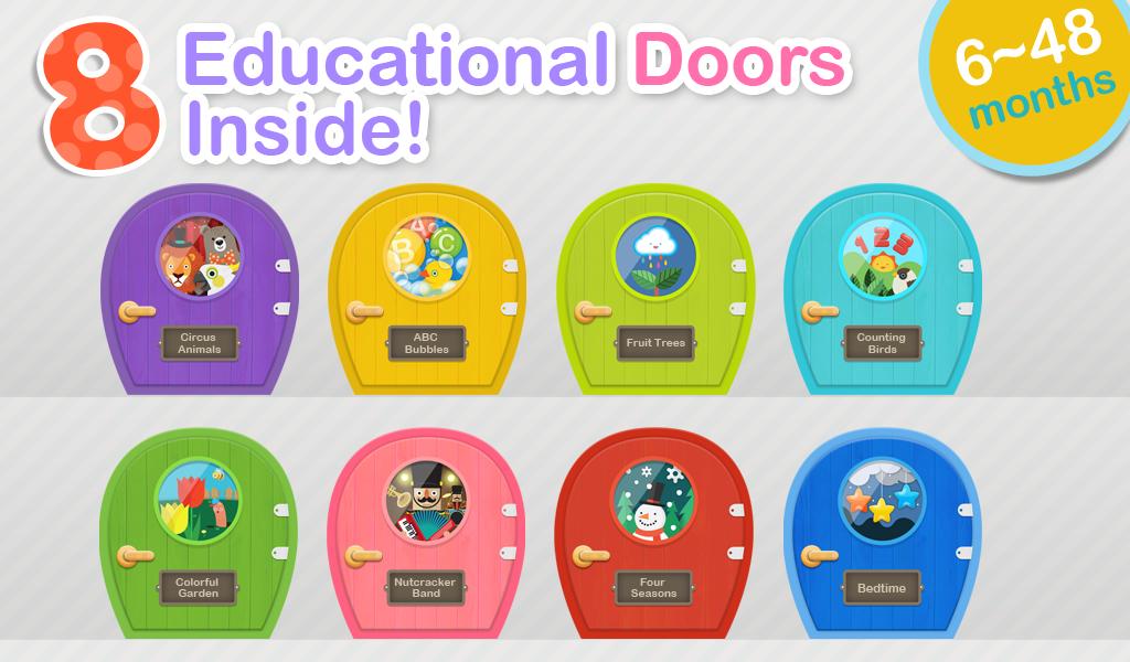 What could be behind those fantastic doors? Enter the 8 different playrooms that lead to the world of learning that are designed to promote imagination and satisfy curious minds. Your kids will learn about numbers, alphabet, colors, animals, seasons, music, among many things. This app is designed for kids between ages of 6 months to 4 years. Fun activities, cute animations and lively sounds will have your kids come back for more and learn while having fun.