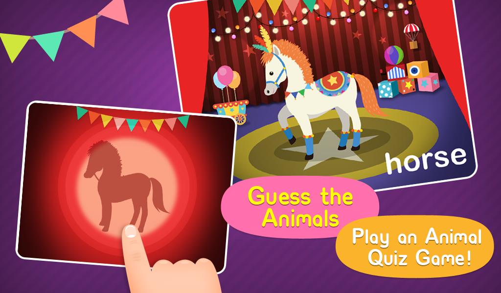 The circus is in town! What type of animals will you see? Guess the animals as their images appear behind the curtain and then watch them perform a trick as the curtain is raised. After the animals perform, review the names and sounds of each animal by playing a fun matching game.