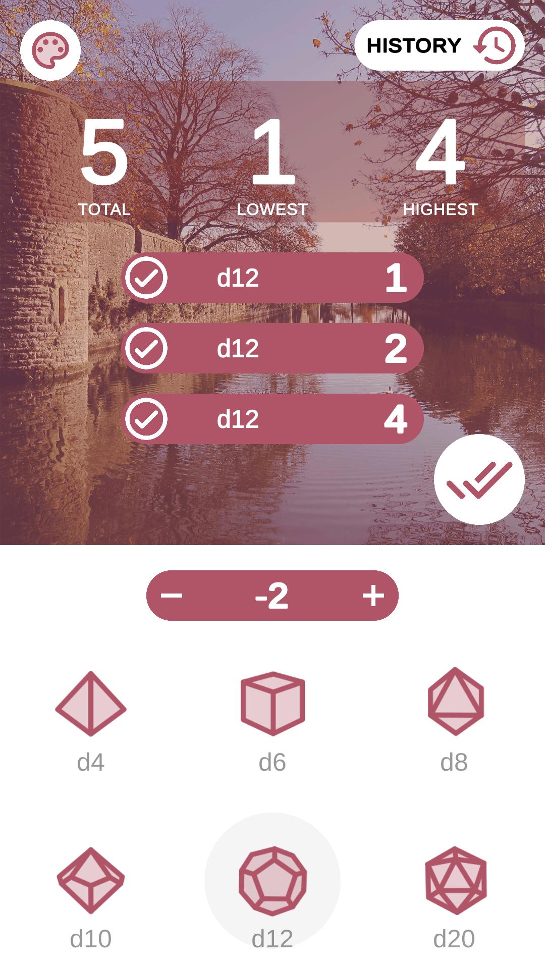 Aplicación de dados para juegos de roles, con un diseño limpio y amigable personalizable con muchos temas diferentes.
