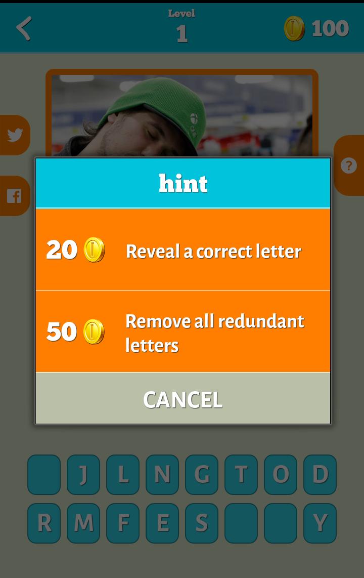- Si estás atascado, tenemos algunas pistas para que encuentres el nombre correcto. Puede usar sus monedas para revelar una carta o puede eliminar todas las letras redundantes. Si las sugerencias no son suficientes para usted, simplemente puede preguntarle a sus amigos utilizando botones de redes sociales.