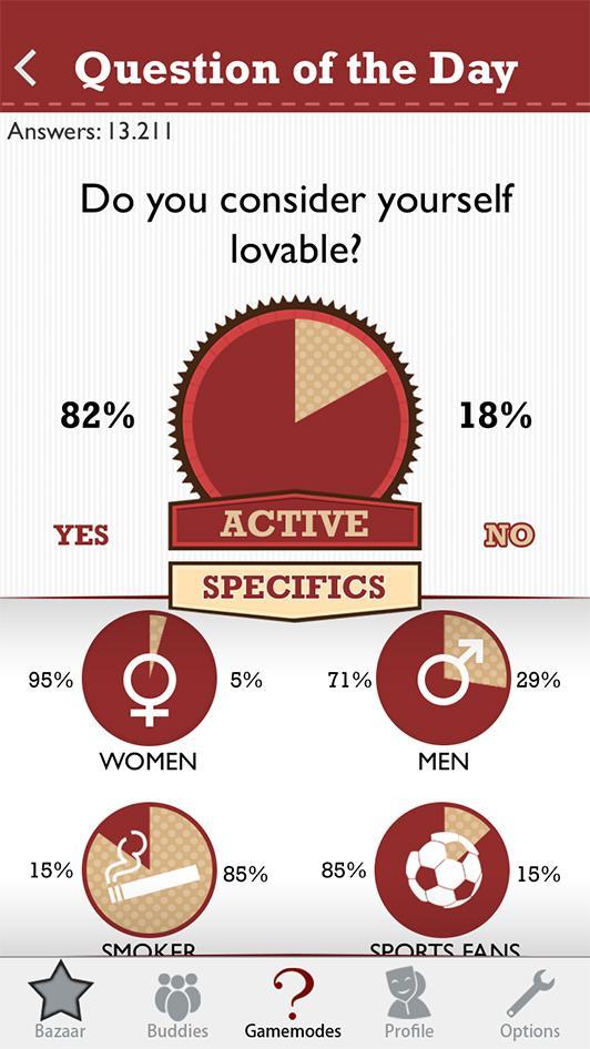 Usted responde a todas las encuestas de forma anónima y puede ver de inmediato si el resto del mundo comparte sus creencias. O qué elecciones hicieron otras partes del mundo. Como hombres o mujeres, adolescentes o dueños de mascotas.