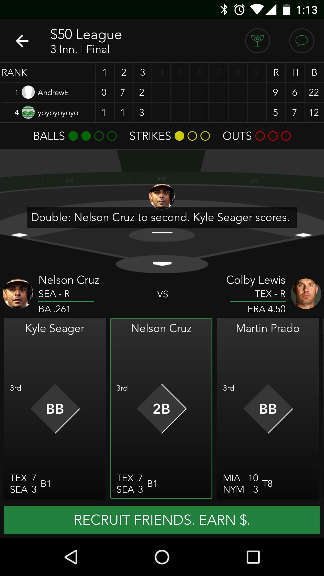 Une fois que les jours de baseball commencent, vous commencez à rédiger votre équipe à partir d'une liste de frappeurs dans les matchs en direct. Étudiez les matchs et choisissez judicieusement parce que le résultat réel de votre joueur sélectionné sera utilisé dans votre jeu.