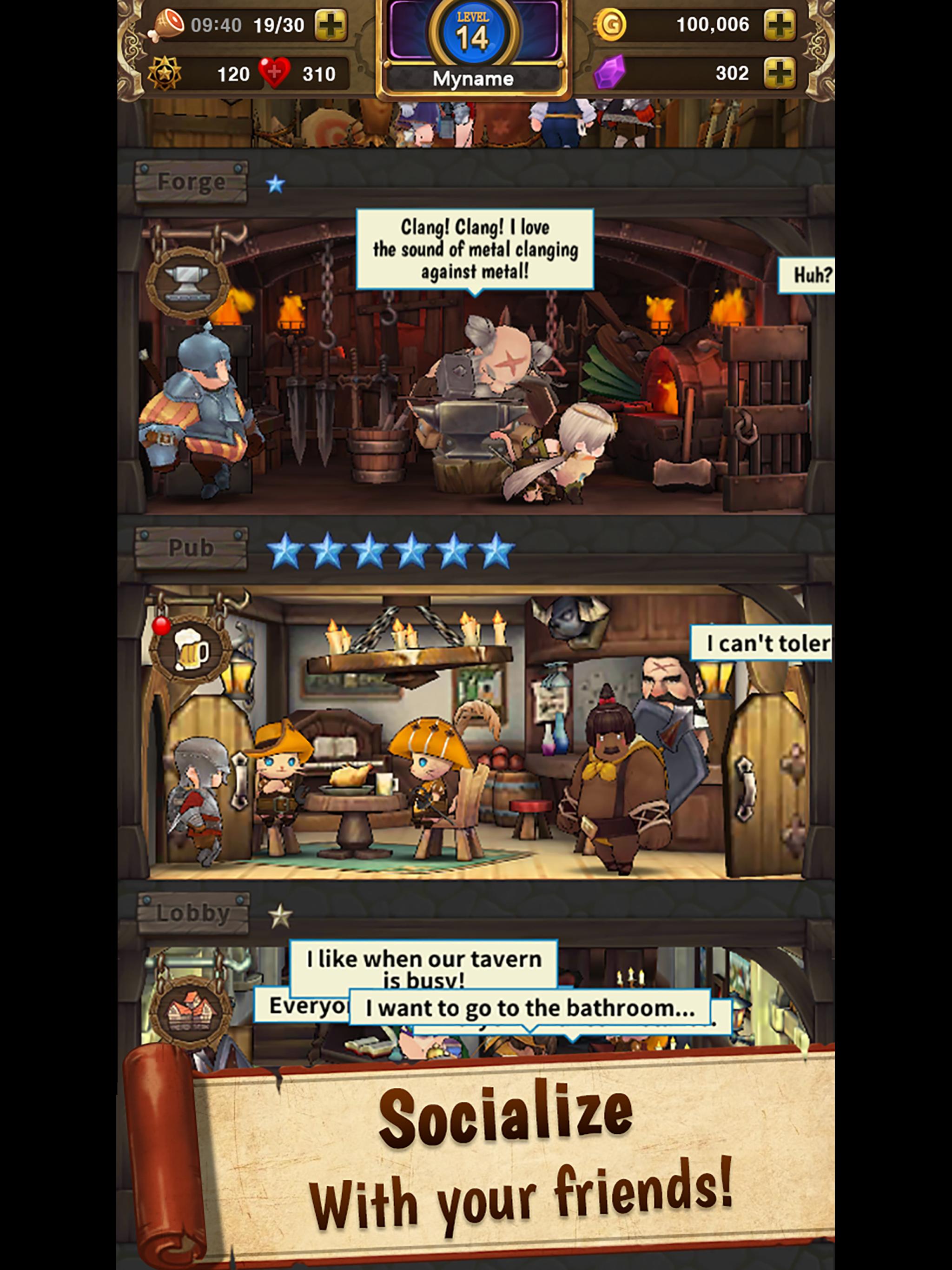 - Variété de fonctionnalités passionnantes et différentes pour chaque étage de pub, forge, camp d'entraînement, boulangerie et plus encore!