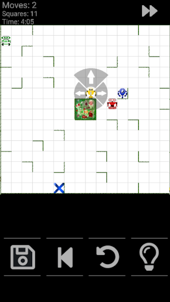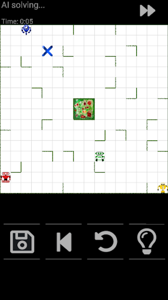Vous contrôlez quatre robots dans une cour pleine de haies, qui se bloquent. L'objectif est de guider un robot particulier vers sa destination. Les robots se déplacent jusqu'à ce qu'ils frappent une haie ou un autre robot.