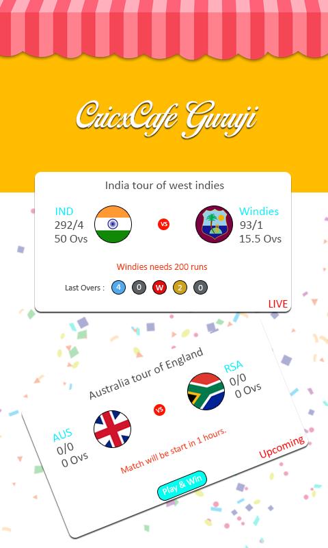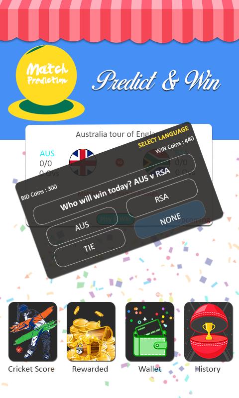 Vous aimez regarder le cricket et intéressé pour prédire les scores et gagner l'équipe? Ici, nous créons une forme de plaque pour votre intérêt où vous pouvez profiter des scores de cricket en direct et également jouer à un jeu de réponses de questions simples pour plus de divertissement. Prédisez la question de la question du jeu et collectez les scores sur les bonnes réponses. Convertissez vos scores et gagnez des récompenses pour vos scores. Aussi plus que les bonnes réponses données par vous que de plus en plus vous gagnez des récompenses.