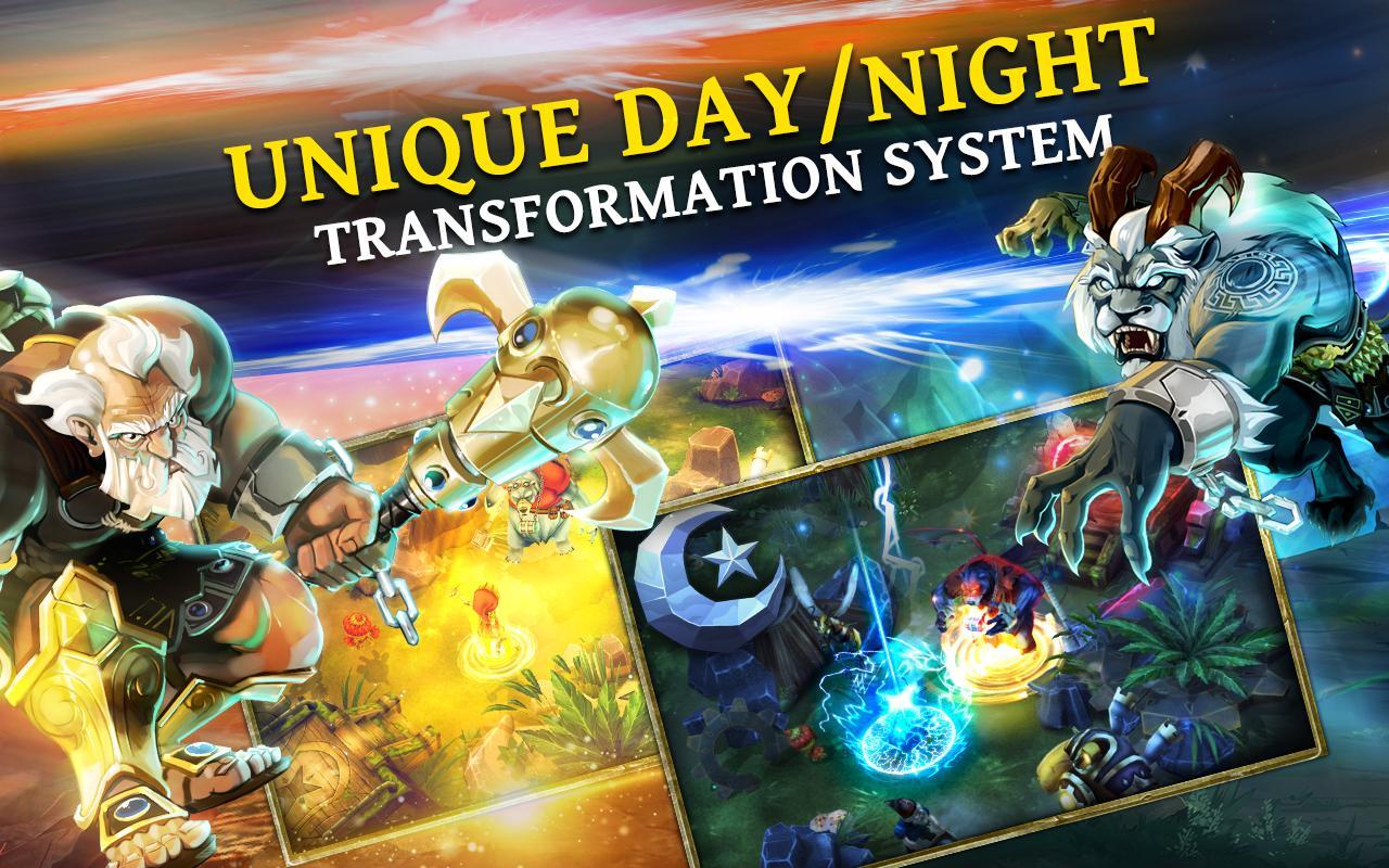 • Unique day/night transformation system where heroes' appearance, stats, and abilities change as day turns into night during battle