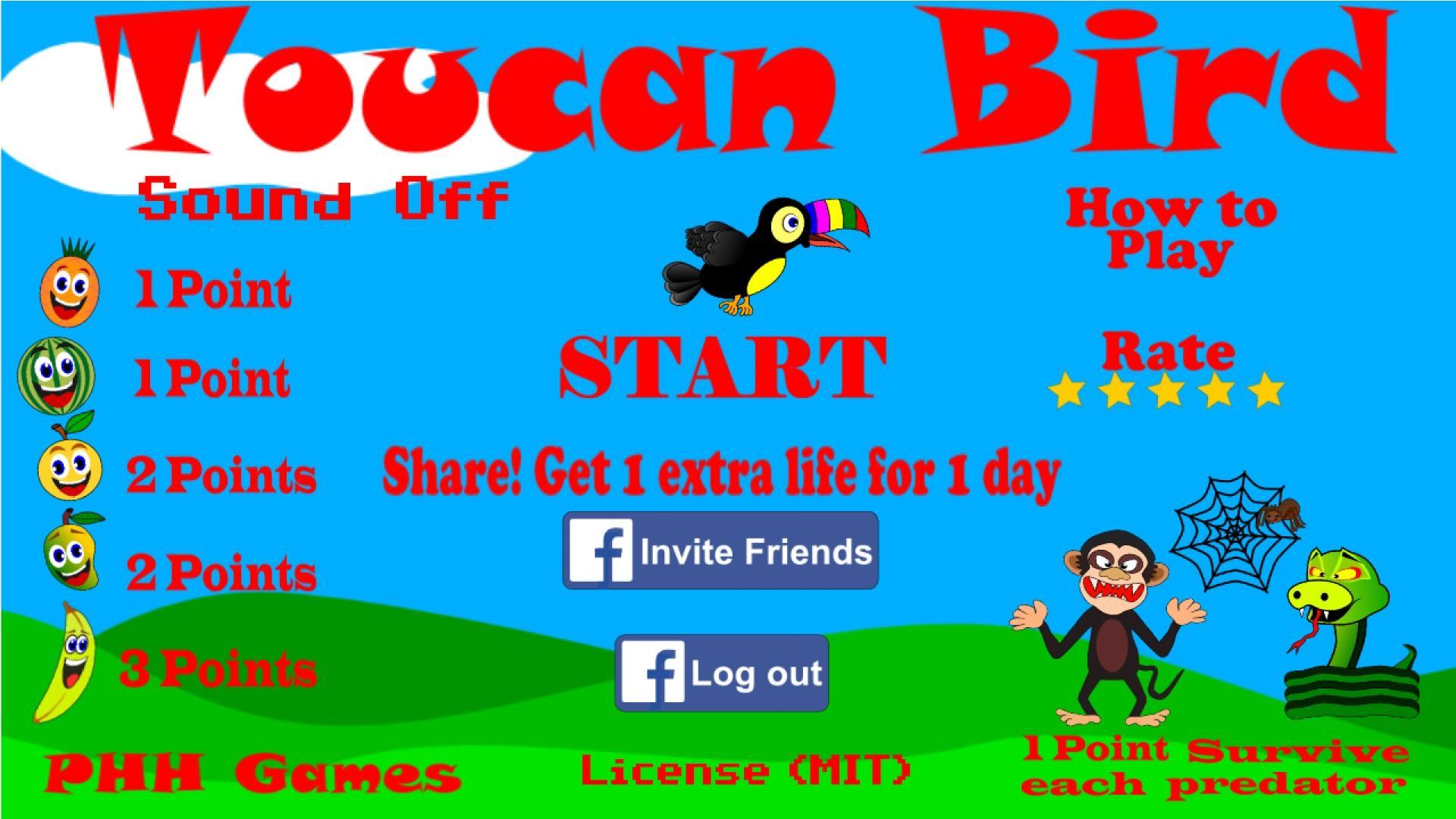 Show your ability and skills by earning points while you keep the Toucan Bird flying without leaving the screen and without crashing with its predators (snake, spider or monkey). The toucan flies with each tap on your mobile screen and it goes down when you do not tap it.