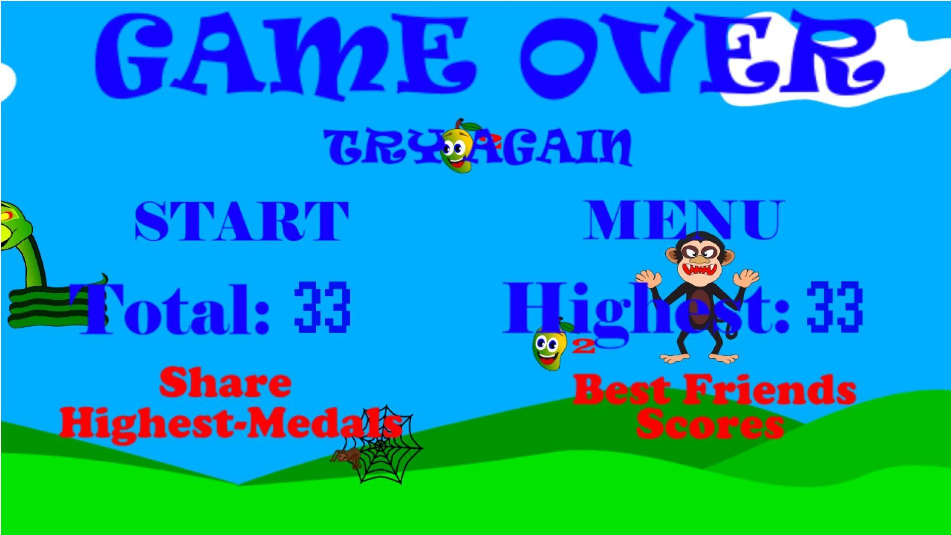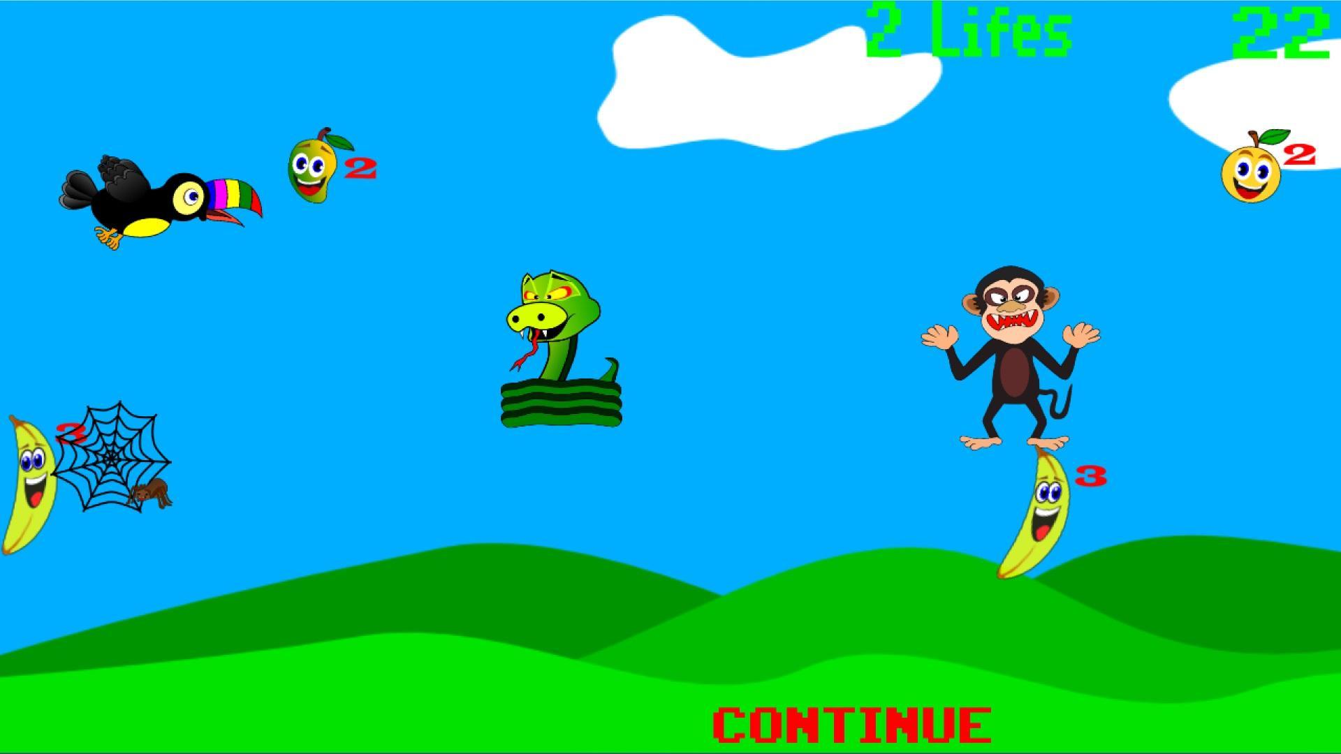 Whenever you are able to pass one of the predators you earn one point. Also, you can earn additional points by taking any of the fruits: one point for the pineapple and the watermelon, two points for the orange and the mango and three points for the banana.