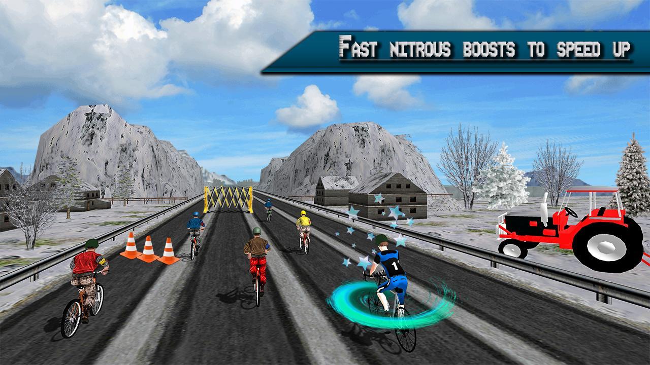 Enjoy reckless racing on amazing 3d snow racing track. Handle your bicycle with easy tilt & steer gestures and avoid collisions with rival racers.