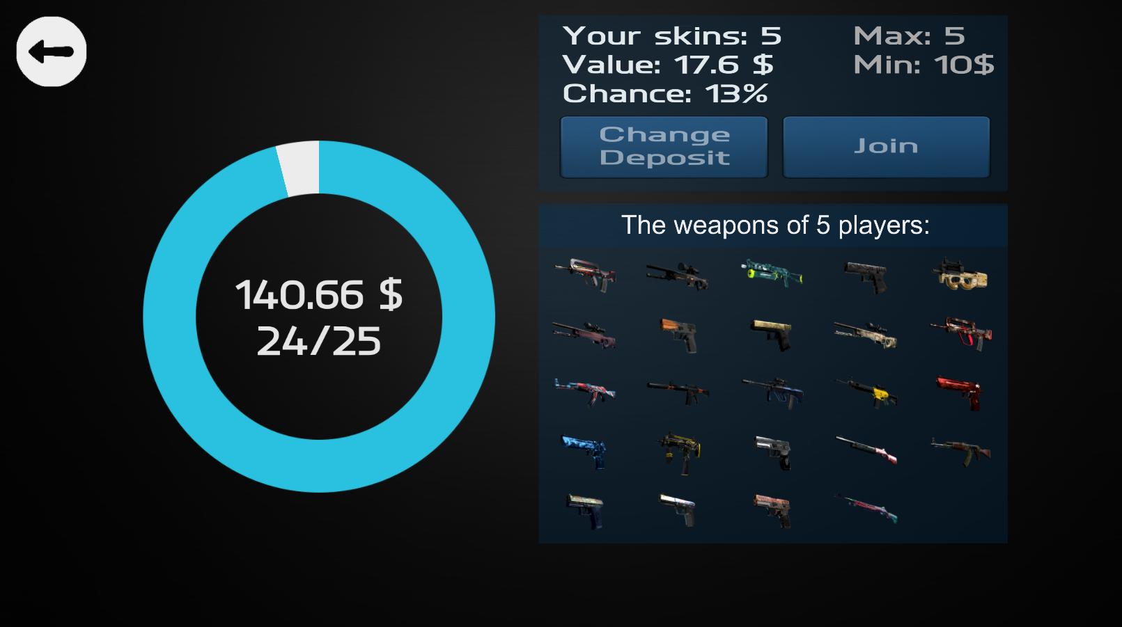 On the main application of the application we have 7 buttons leading to open boxes, your inventory - here you can see your acquired items, contracts - here you can fill out the contract, which you need 10 weapons of the same class to get up to the upper class weapons, statistics, jackpot - simulation of playing in roulette where you add to the pool of weapons with a value, and depends on the value of your pool chances of winning. And also New Jackpot V2 where you exchange weapons for gold and you play roulette with this gold.