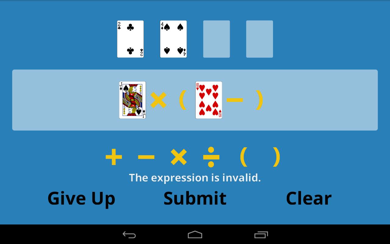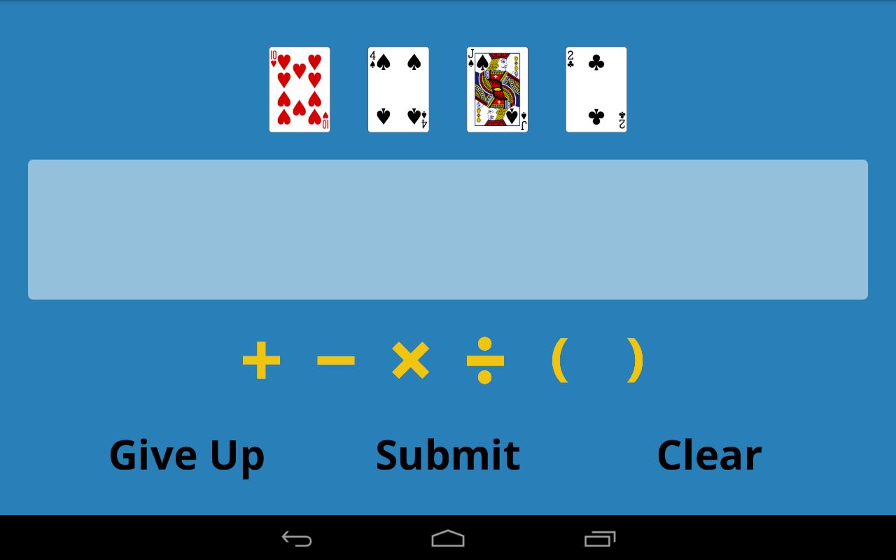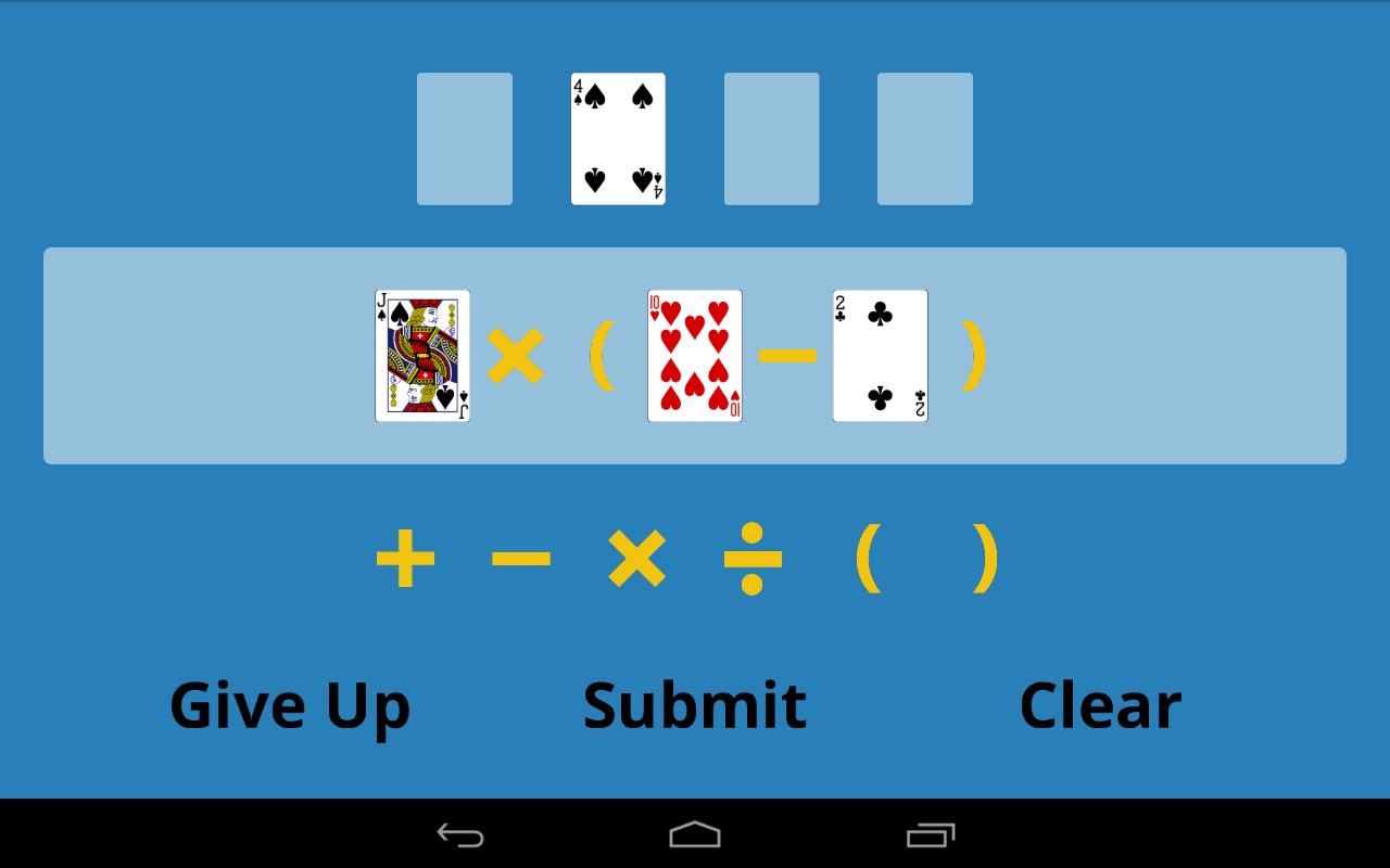 The objective is to arrange the cards and arithmetic signs into a formula which gives 24.
