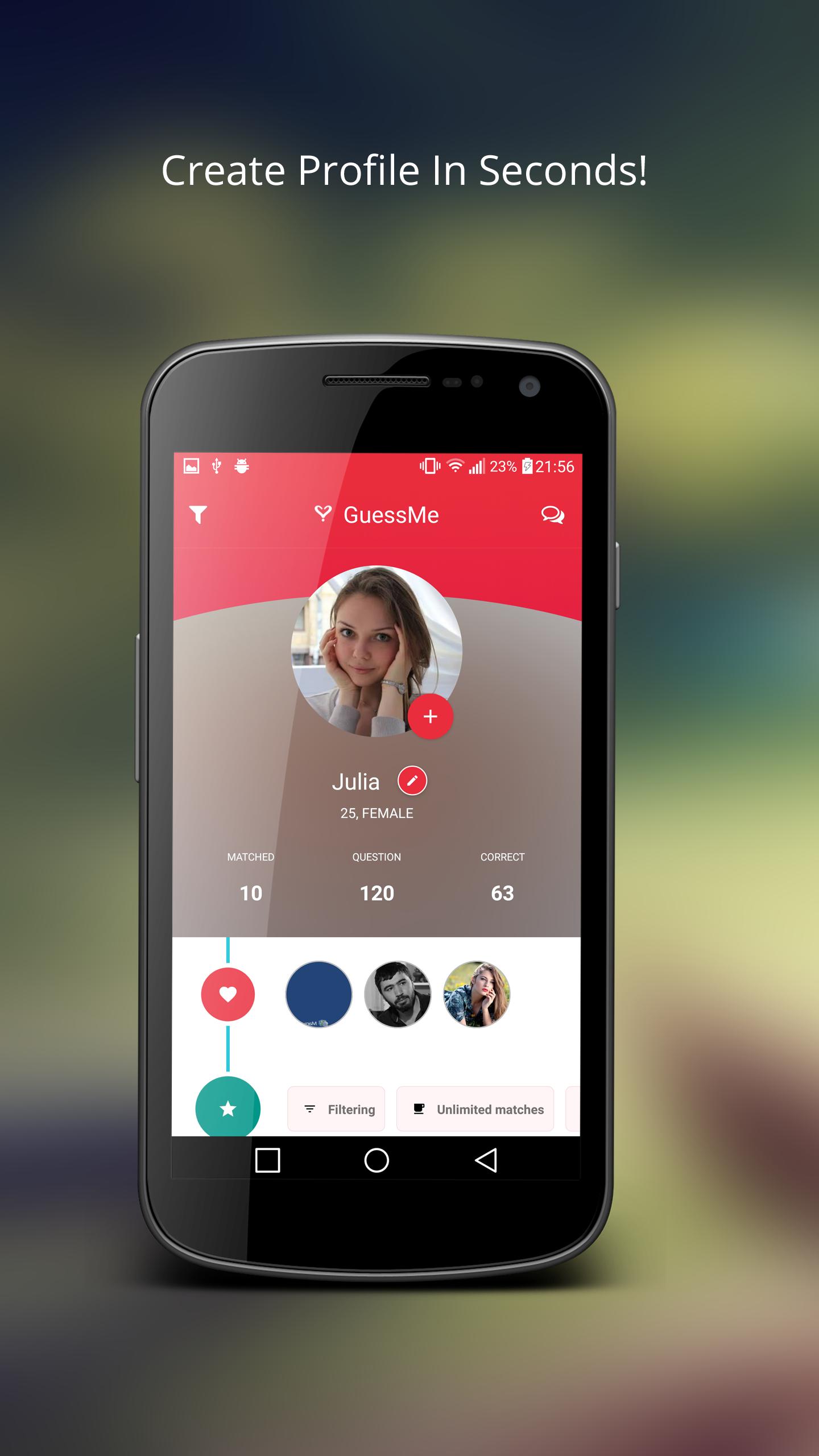 Anda tidak harus memutuskan hubungan memulai dengan orang -orang dengan melihat hanya beberapa foto mereka! GuessMe memberikan nilai maksimum kepada masing -masing pengguna untuk memberi tahu mereka satu sama lain dan mendukung keputusan tidak hanya berdasarkan beberapa gambar, tetapi juga mengajukan pertanyaan intim untuk dicocokkan. Jadi, orang -orang memiliki momen lucu dan mengenal mitra Anda dengan cara yang serbaguna.