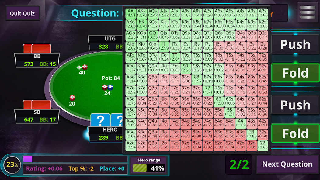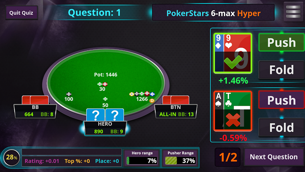 Jawab kuis dan dapatkan umpan balik instan dari pelatih untuk membantu mengembangkan permainan preflop Anda.