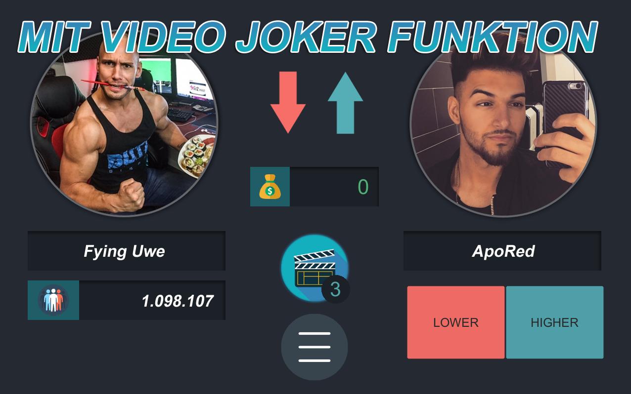 Pemain terbaik di YT yang lebih tinggi atau lebih rendah diabadikan dalam tabel skor tinggi selama tidak ada yang menyalipnya dalam skor tinggi. Apakah Anda sudah sangat jauh dalam permainan pengetahuan dan tidak yakin YouTuber mana yang memiliki lebih banyak pelanggan? Kemudian gunakan salah satu dari tiga pelawak yang tersedia untuk Anda di setiap game. Joker memberi tahu Anda apakah Anda harus menekan lebih tinggi atau lebih rendah. Jika ketiga joker sudah habis, Anda harus mencoba bergaul sendirian.
