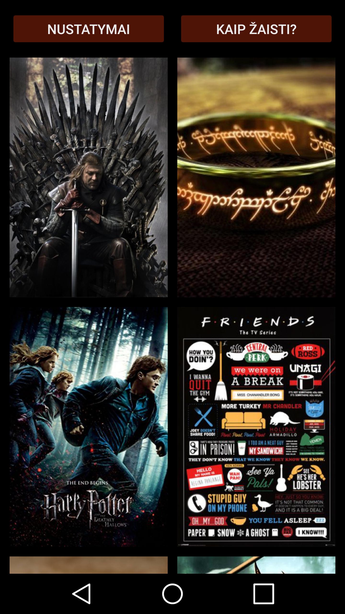 * Dalam game adalah 6 (untuk saat ini) Decks Word (Game of Thrones, Friends, Lord of the Rings ....);