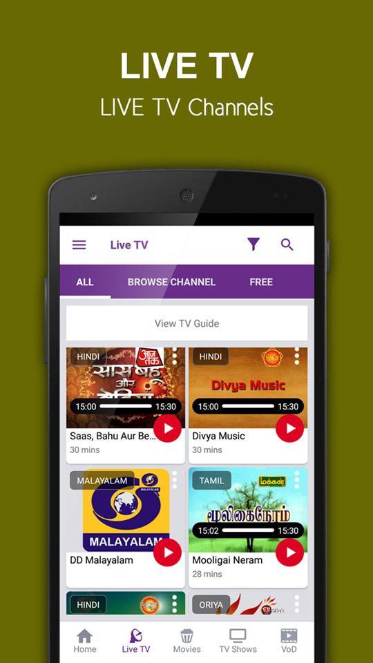 Videocon D2Hは、顧客に顧客にもたらします。これは、モバイルでお気に入りのテレビチャンネルを見るというまったく新しい体験です。 Videocon D2HをDirect to Mobile紹介することは、100以上のライブテレビチャンネルと5000以上のビデオオンデマンドコンテンツをモバイルで視聴するための魅力的なエンドユーザーエクスペリエンスを提供します。お気に入りのテレビチャンネル、ショー、映画などをモバイルデバイスでお楽しみください。このサービスは、すべてのVideoCon D2Hサブスクライバーが独占的に利用できます。