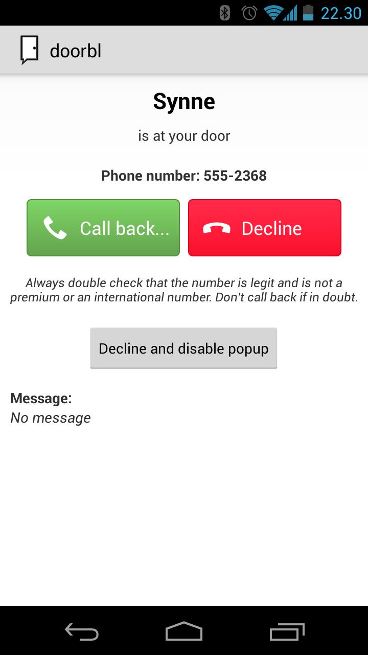 外の人はNFCタグに触れたり、玄関のQRコードをスキャンして電話番号を残します。すぐに通知され、コールバックを選択できます。