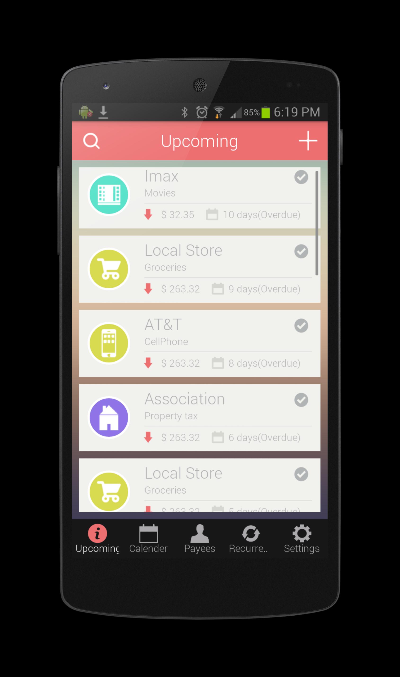 請求書を思い出させることを心配する必要はもうありません。 「請求書のリマインダー」を入手して、請求書を追跡します。 「Bills Reminder」をダウンロードし、今後の請求書(収入または費用)について通知を取得します。今、あなたはあなたの忙しいスケジュールを歩きながらあなたの請求書を支払うのを忘れることを心配する必要はありません!