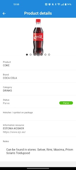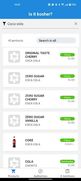 製品の名前を入力して検索を押すだけで、アプリはKosher認定の詳細についてはKosher当局データベースをスキャンします。