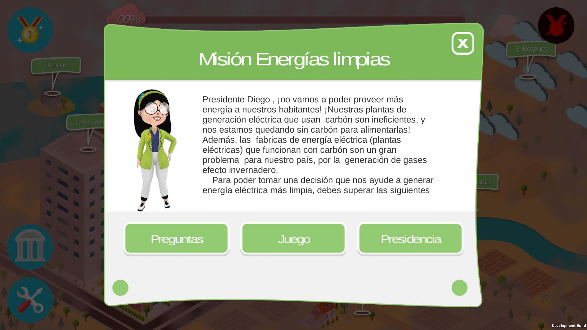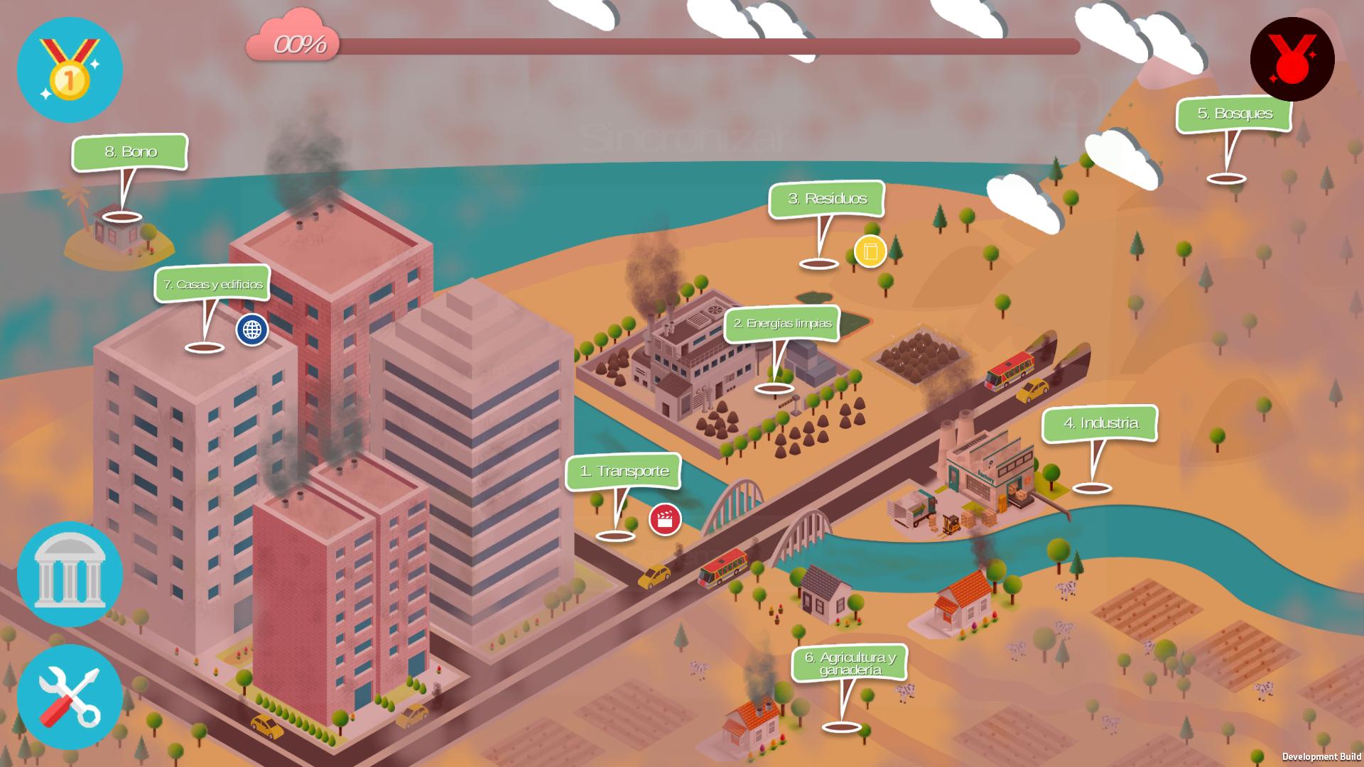 目的は、プレーヤーが意思決定者( Mi Colombia 2050の社長)の役割を占め、自国の温室効果ガス排出量を削減することです。これは、経済のさまざまなセクター(輸送、住宅、廃棄物、農業、家畜、林業など)における緩和策の実施のための投資予算を蓄積するためにクレジット(通貨)を取得することによって行われます。