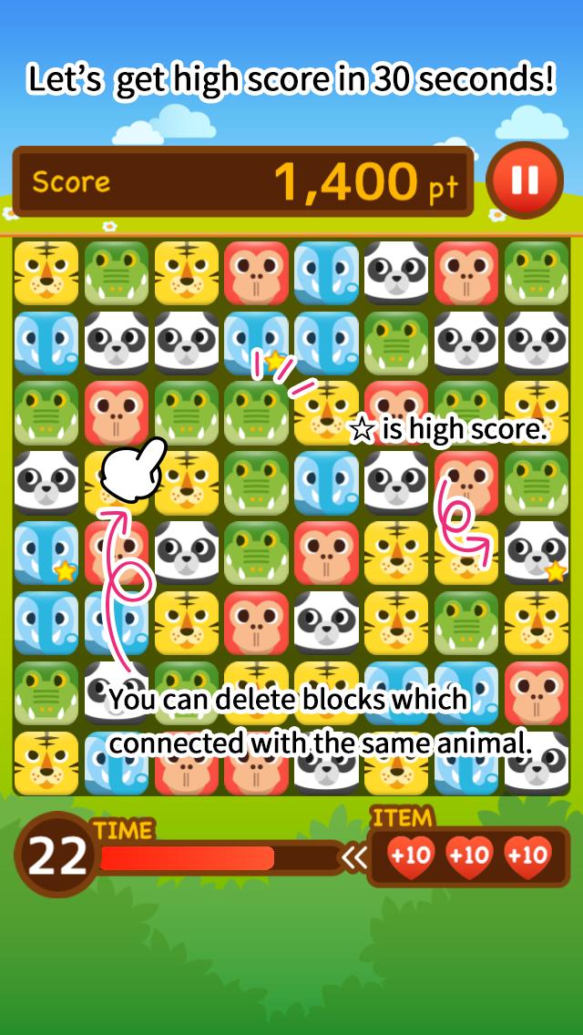 PuZoo 、「同じゲーム」ゲームシステムに基づいたシンプルな動物パズルゲームです。たくさんの動物をタップして、30秒でハイスコアを獲得してください!