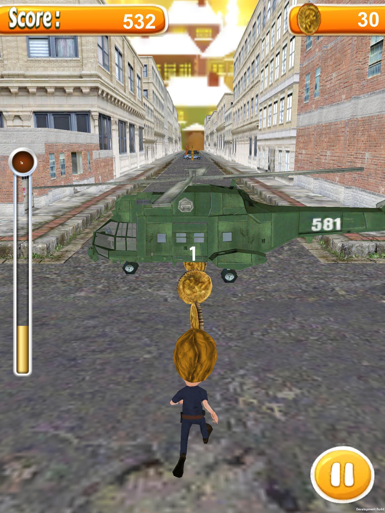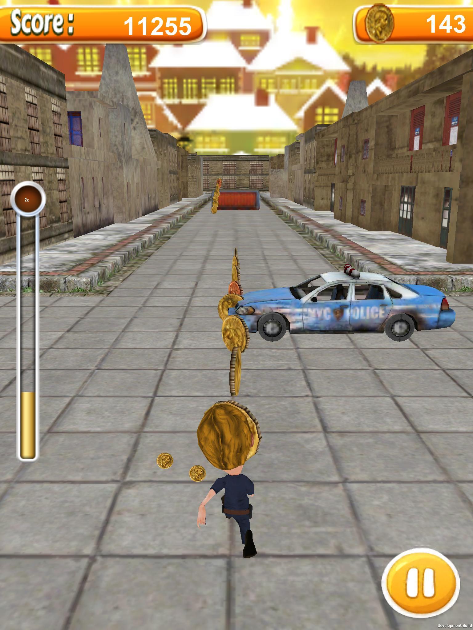 この3Dエンドレスランニングゲームは、多くのバス停、パトカー、バレル、木枠、タイヤ、ヘリコプターで構成され、彼が逃げないようにします。