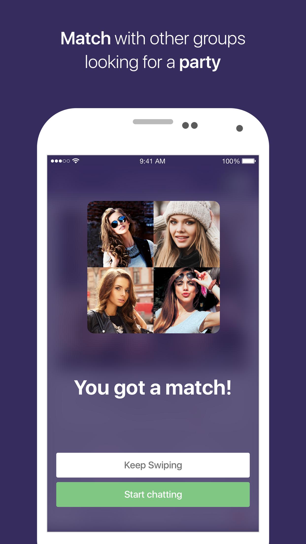두 그룹이 둘 다 오른쪽으로 스 와이프하면 (좋아요), 그것은 일치합니다! 이 두 그룹이 연결하려면 각 그룹의 한 사람 만 필요합니다. 일치하는 즉시 푸시 알림이 모든 그룹 구성원에게 즉시 전송됩니다.